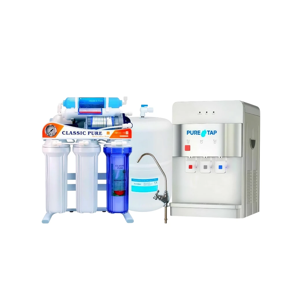 جهاز تحلية مياه بتقنية التناضح العكسي (RO) من تصميم تايواني، يقدم نظام تنقية مكوّن من تسع مراحل متقدمة مصممة لتوفير مياه شرب نقية وآمنة بجودة يومية ملائمة للمنازل والمكاتب. يأتي كنظام متكامل يتضمن قاعدة للحامل، ساعة قياس ضغط مدمجة وبرادة/مبرد مياه لتهيئة مياه باردة حسب الحاجة.