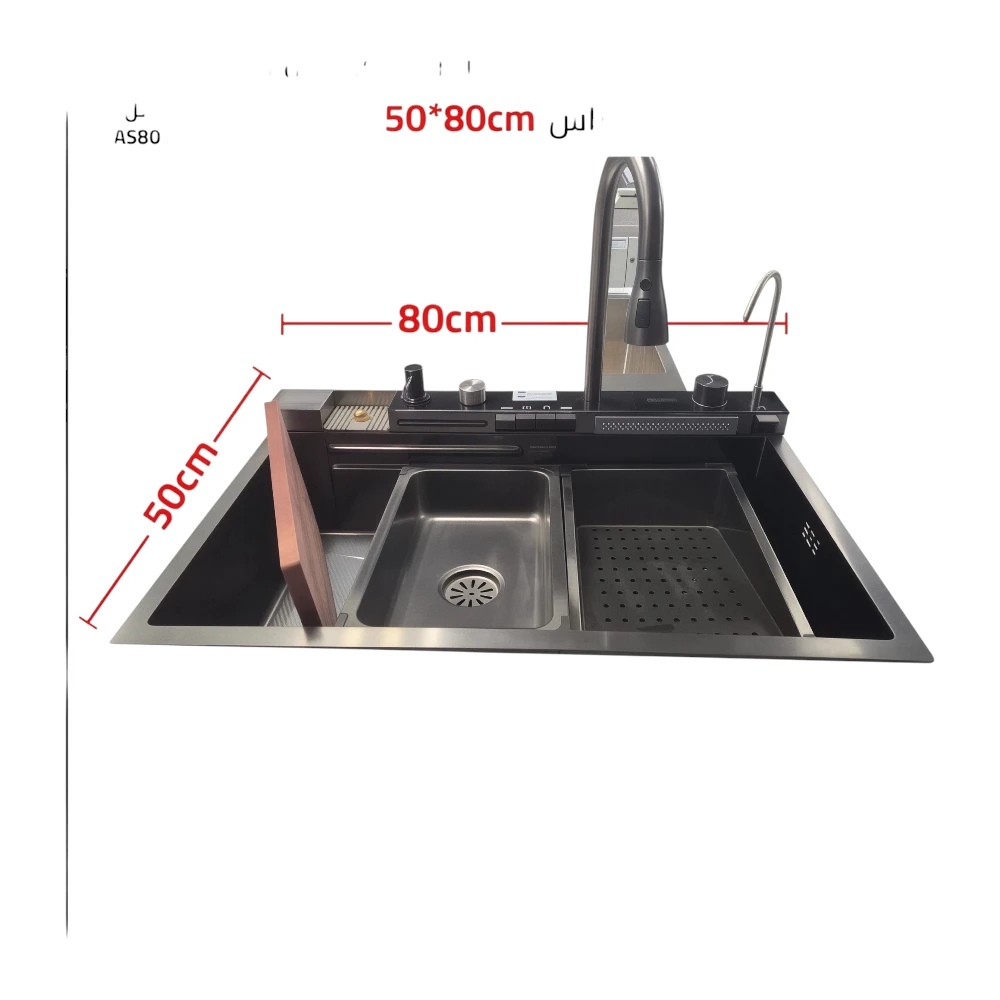 مجلى مطبخ ستانلس ستيل نانو أسود متعدد الوظائف مع خلاط شلال ورشاش – 80×50 سم