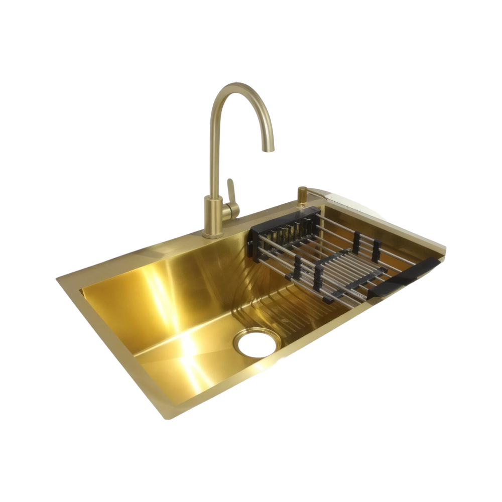 أضف لمسة فاخرة وعصرية إلى مطبخك مع مجلى SINDBAD المصنوع من استانلس ستيل 304 عالي الجودة والمُشطب بتقنية النانو بلون ذهبي أنيق. تصميمه عملي ومتين للاستخدام اليومي، مع مقاومة للخدوش والبصمات ومجموعة ملحقات متكاملة لتجربة استخدام سلسة ومتكاملة.