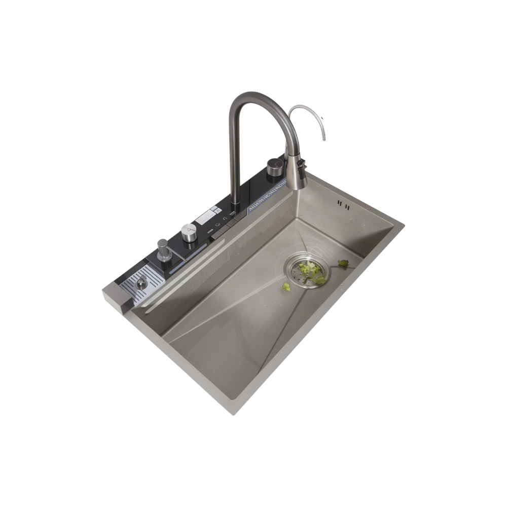 حوض مطبخ عملي وعصري مصنوع من الستانلس ستيل بقياس 75×46 سم، مزوَّد بخلاط مدمج ولوحة تحكم علوية. يمكن تركيبه بشكل علوي أو سفلي، ويأتي مع ملحقات لتصريف المياه وتجهيز الطعام، ما يسهّل الاستخدام اليومي ويمنح المطبخ مظهراً مرتباً ووظيفياً.