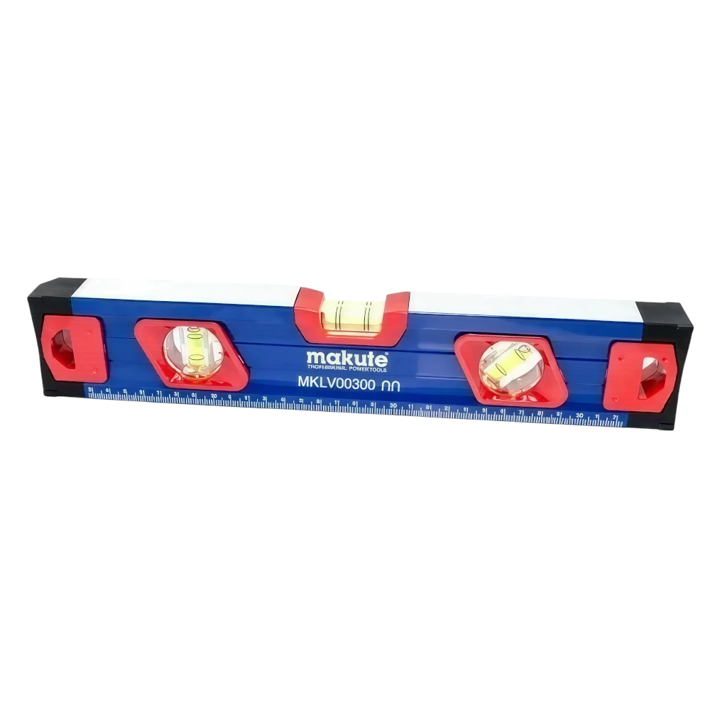 ميزان ماء بطول 300 مم من ماركة ماكيوت، مصنوع من الألومنيوم ومزود بثلاث فقاعات قياس لتسهيل ضبط الاستواء الأفقي والرأسي في أعمال التركيب والإنشاء.