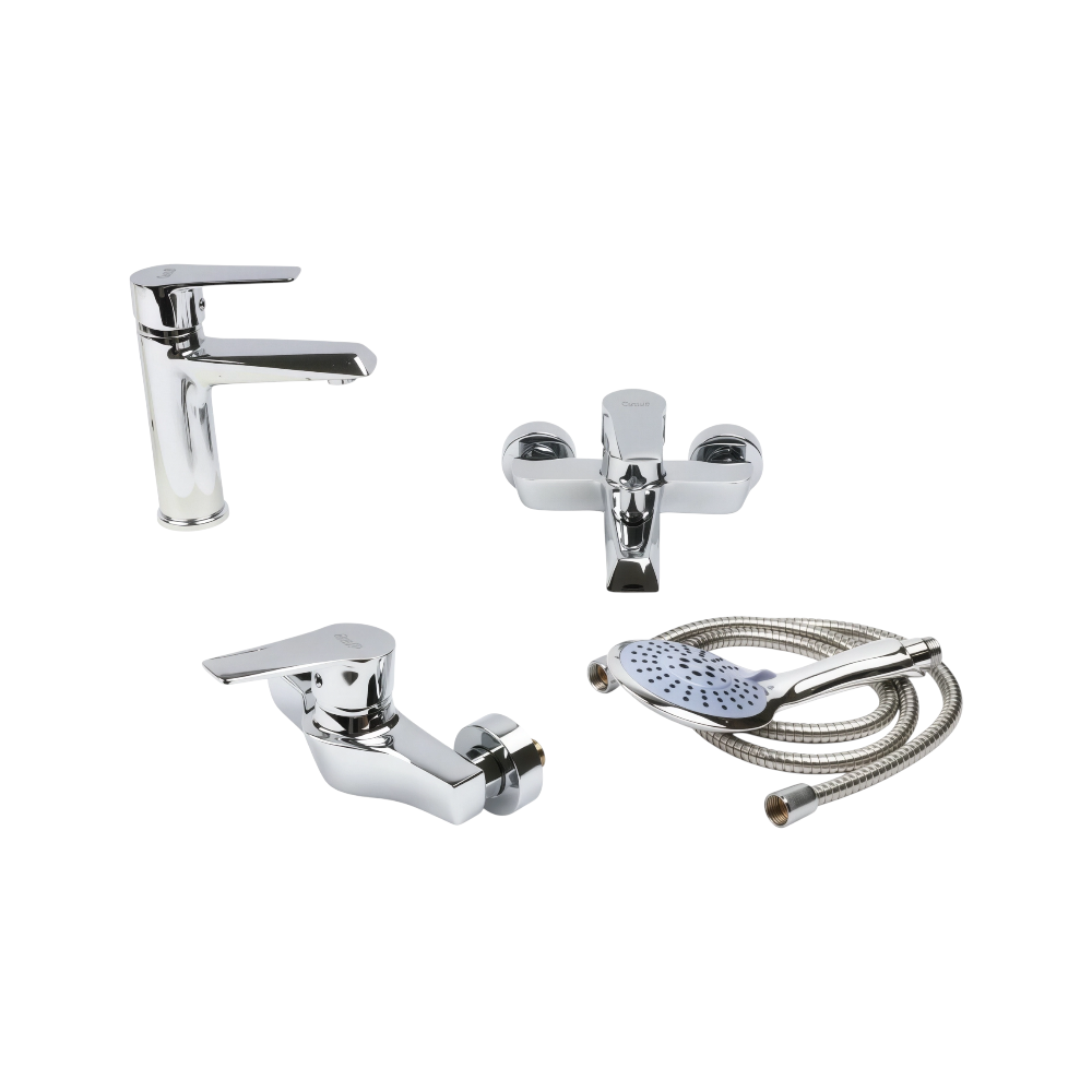 - طقم متكامل يشمل: خلاط الدش، خلاط المغسلة، وخلاط الشطاف — تناغم في الشكل واللون.