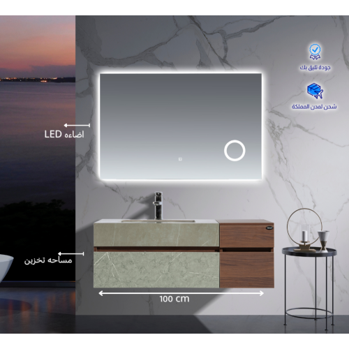 - المادة: خشب بلايوود معالج + حوض سيراميك + مرآة LED