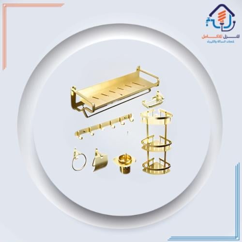 أضف لمسة من الفخامة والتناغم إلى حمامك مع طقم إكسسوارات ذهبي أنيق مكوّن من 6 قطع. تم تصميم الطقم ليجمع بين الوظيفة والجمال، ويوفّر مظهراً متناسقاً يرفع من جمالية المساحة ويبقي الأدوات الأساسية مرتبة وسهلة الوصول.