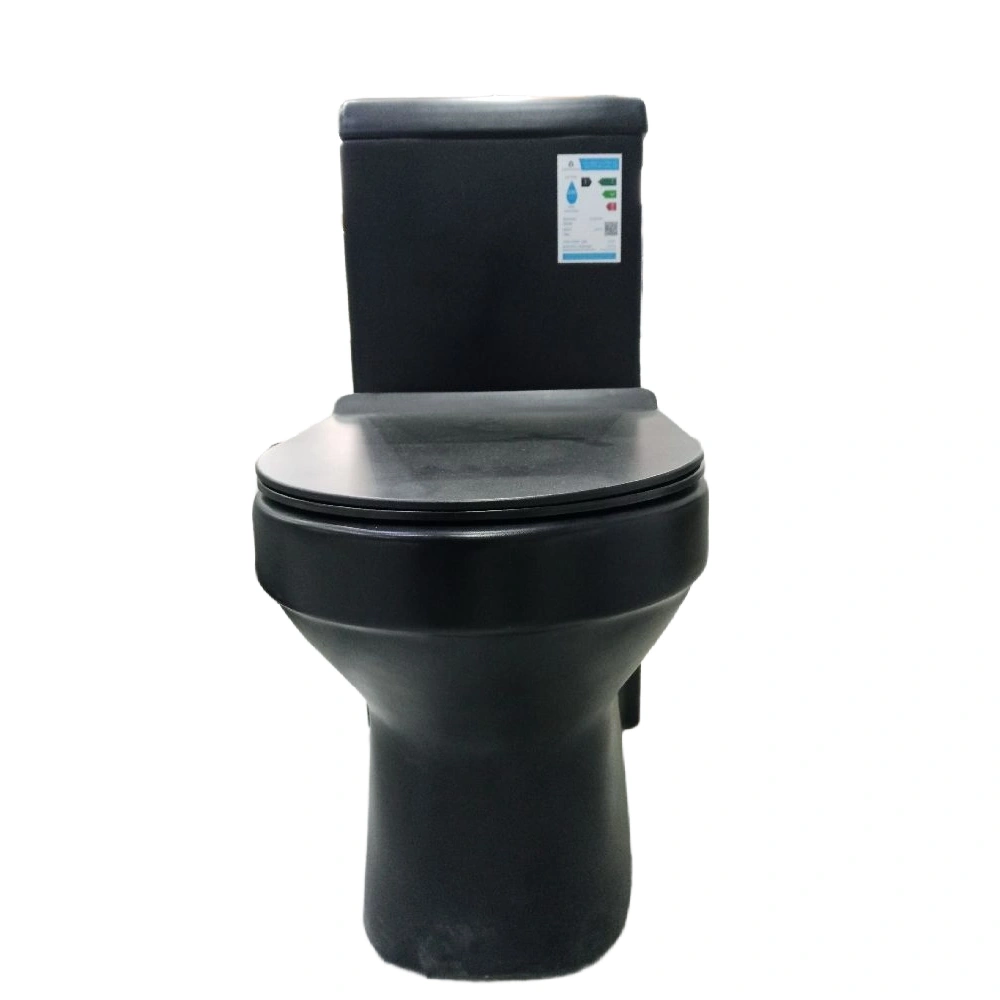 مرحاض أرضي أنيق مصنوع من السيراميك بلون أسود، مزوَّد بخزان علوي للتدفق وكرسي مرحاض مدمج، مصمم للتركيب الأرضي التقليدي في الحمامات السكنية أو المرافق الصحية.