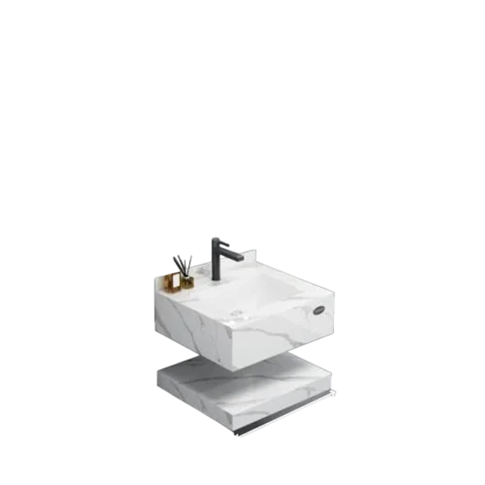 - المادة: رخام صناعي + خزانة من خشب معالج مقاوم للماء