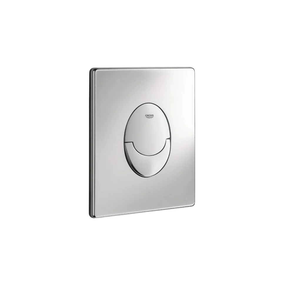 The Grohe Skeet Cosmopolitan pressure plate has a stylish chrome finish, designed to complement modern bathroom decor and provide practical, water-saving performance.