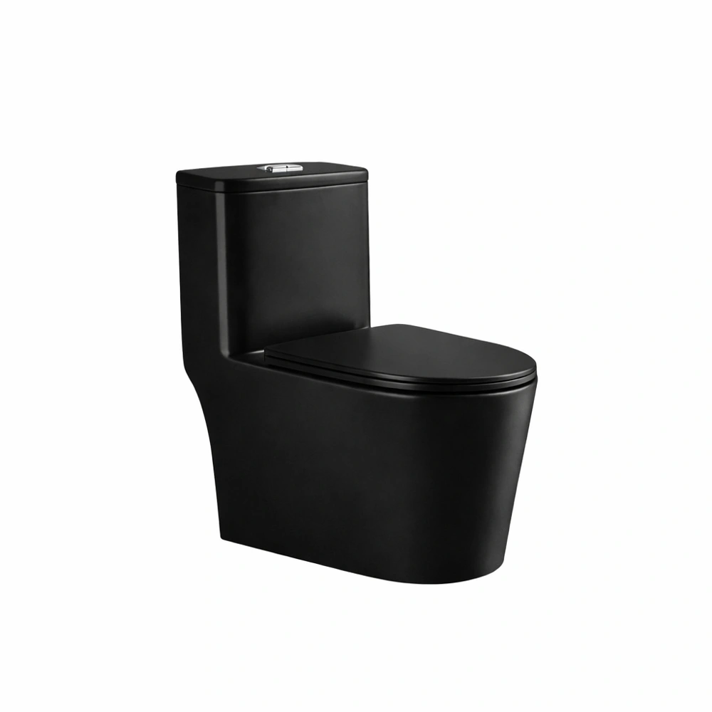 The black Halfer one-piece toilet combines beauty and practicality: a stylish design that enhances the look of the bathroom, and a sturdy construction that makes maintenance and installation easy, making it a standout choice for any home or renovation project.