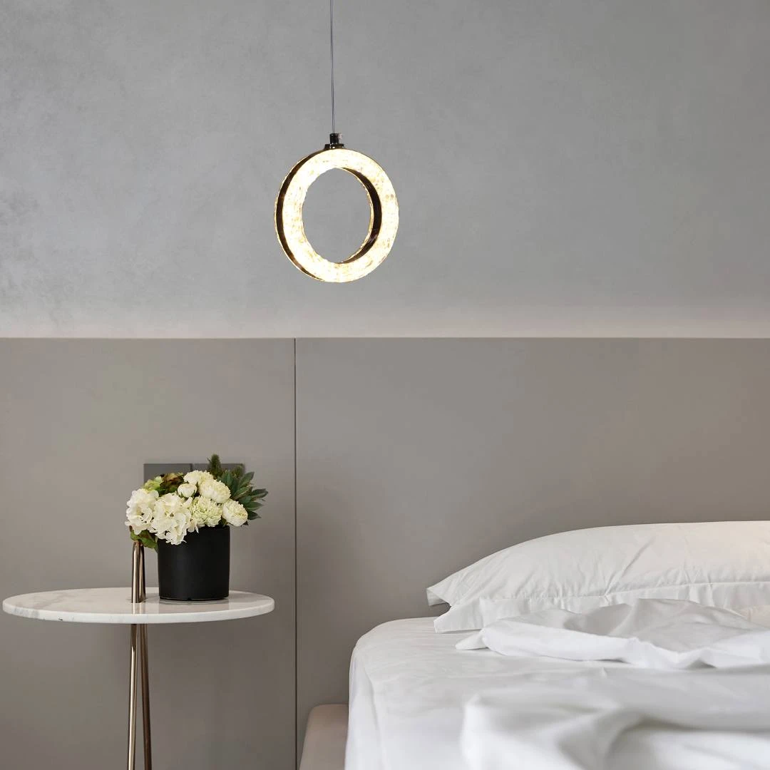 A single chandelier with a sleek, modern design in black, ideal for tranquil spaces thanks to its warm lighting and streamlined shape. It combines a minimalist aesthetic with energy efficiency using LED technology.