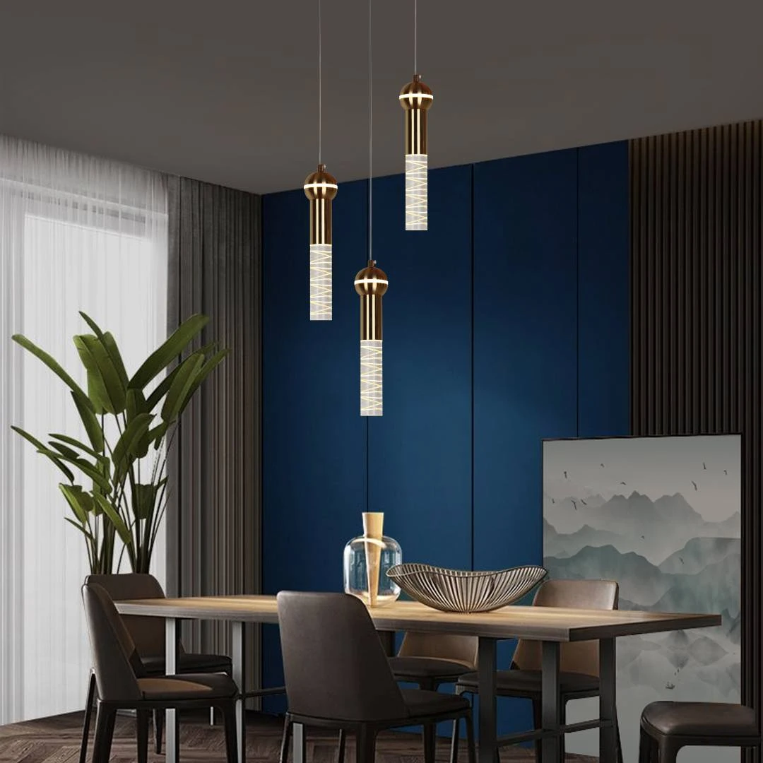 A stylish, modern pendant chandelier with a gold finish, providing soft LED lighting that helps create a comfortable and cheerful atmosphere. Suitable for bedrooms, living rooms, and spaces that require a contemporary look with adjustable color temperature.
