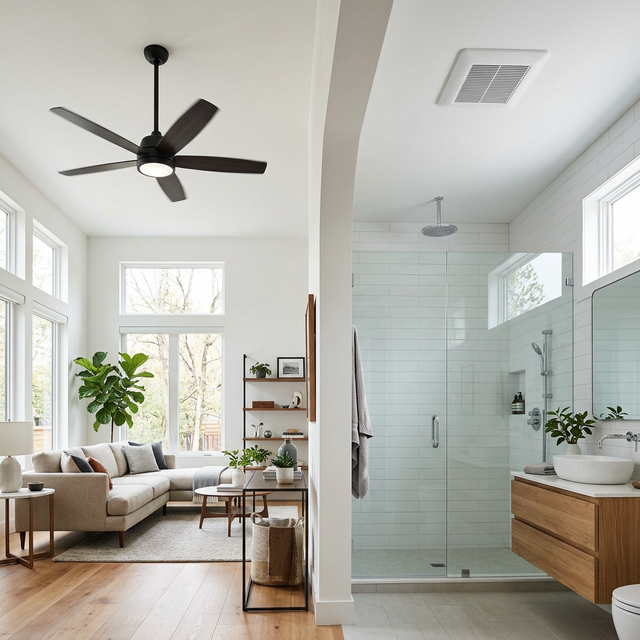 - للحمام: مروحة شفط 6 أو 8 إنش بمعدل CFM يناسب حجم الحمام.