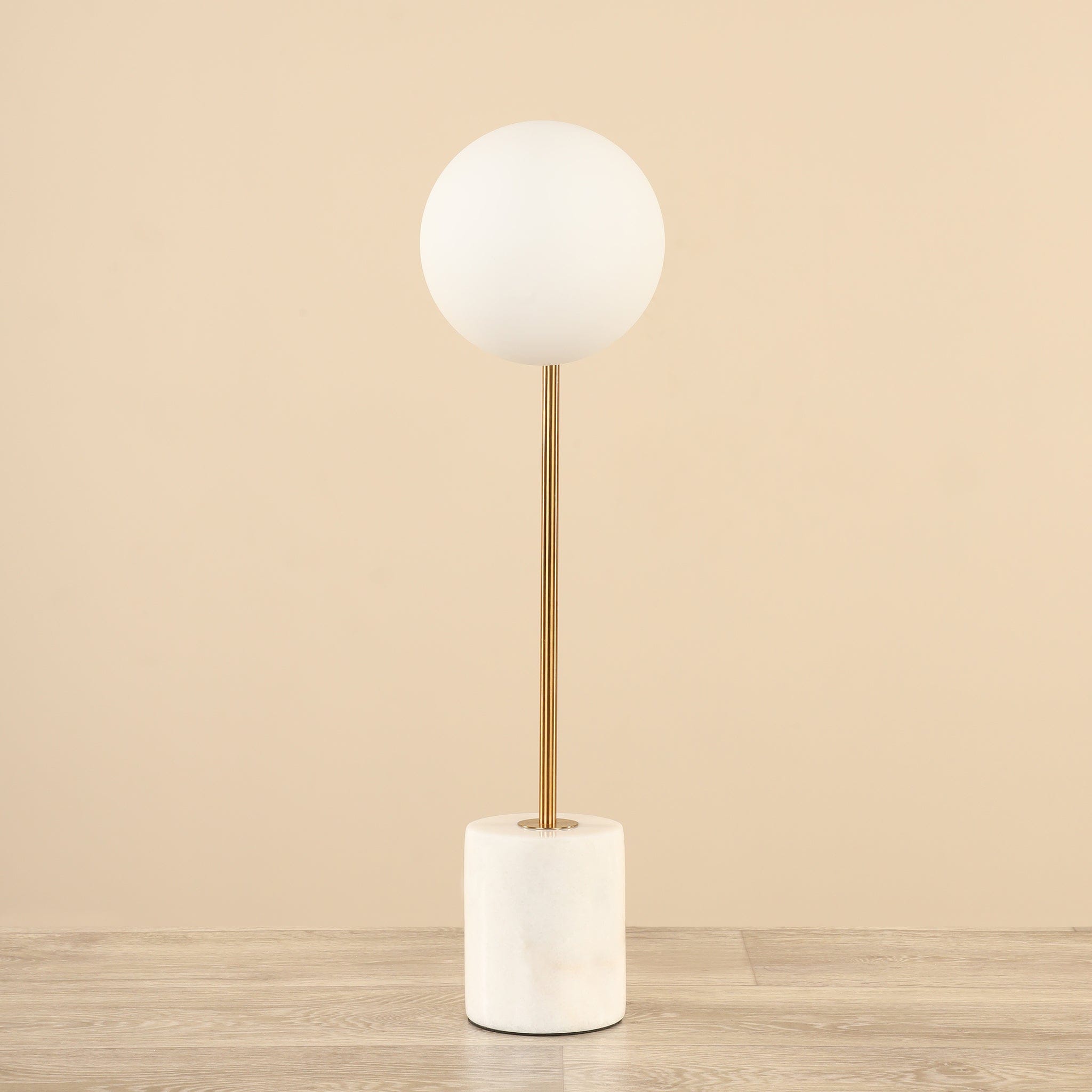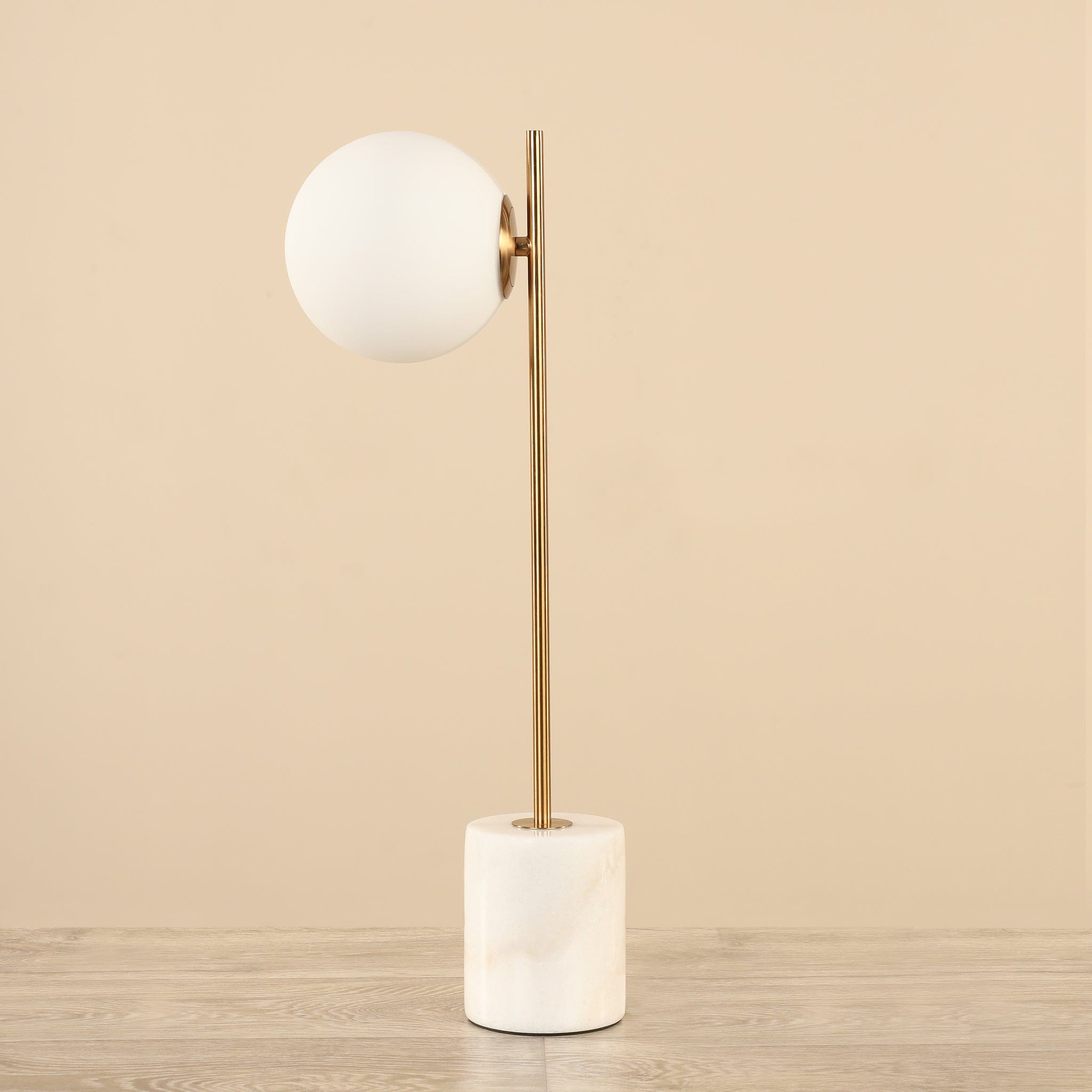 أباجورة أنيقة تجمع بين جمال الرخام وبساطة التصميم المعدني والزجاجي. تتميز بخطوط عصرية ومظهر أبيض ناصع يضيف لمسة فاخرة ودافئة إلى أي مساحة داخلية — مناسبة لغرفة المعيشة، غرفة النوم أو مكتب العمل.