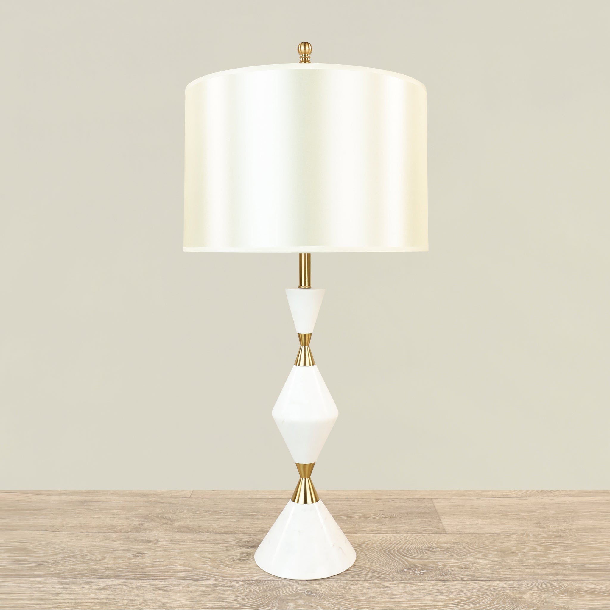 امنح طاولتك لمسة أنيقة وفاخرة مع هذه الأباجورة المصممة بعناية. تجمع بين قاعدة رخام أبيض أصلي لمظهر متين وفخم وظل لوني كريمي يضفي دفئاً ناعماً على الإضاءة، مع لمسات طلاء معدني بلون برونز فاتح لتأثير كلاسيكي معاصر.