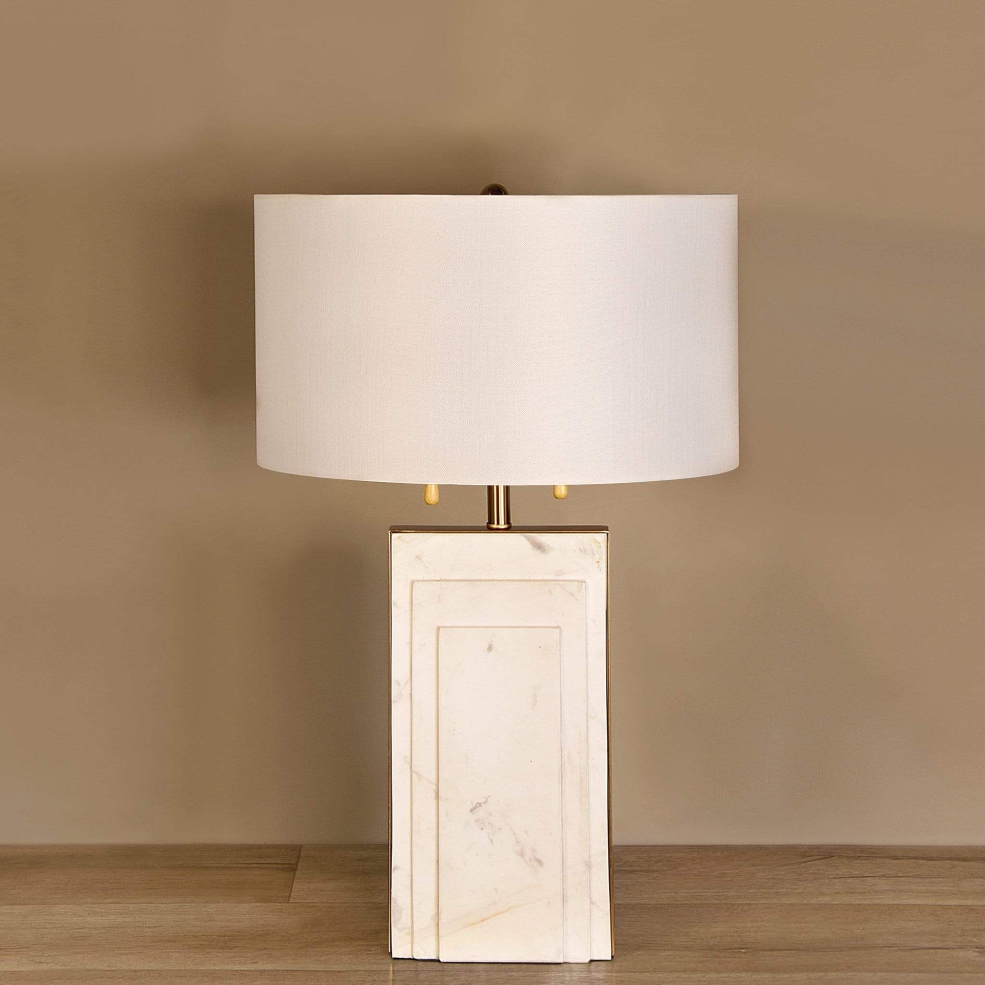 أباجورة أنيقة مصنوعة من الرخام الطبيعي والنحاس بتشطيب برونزي فاتح، تضيف لمسة فاخرة ودافئة إلى غرفة المعيشة أو غرفة النوم أو المكتب.