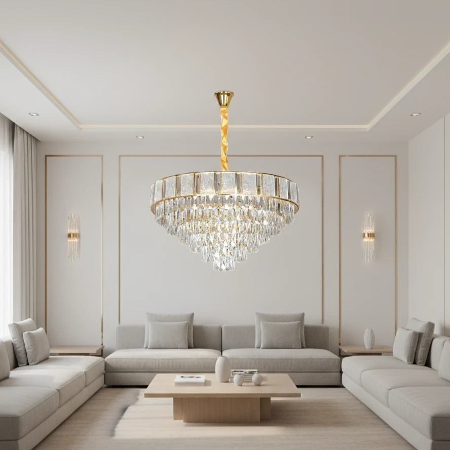 نجف كريستال فاخر بتصميم مودرن أوروبي، يجمع بين بريق الكريستال ودفء التشطيب الذهبي. يخلق إضاءة متوازنة ومميزة تعزز من أجواء الغرف وتضفي طابعًا أنيقًا على الديكور.