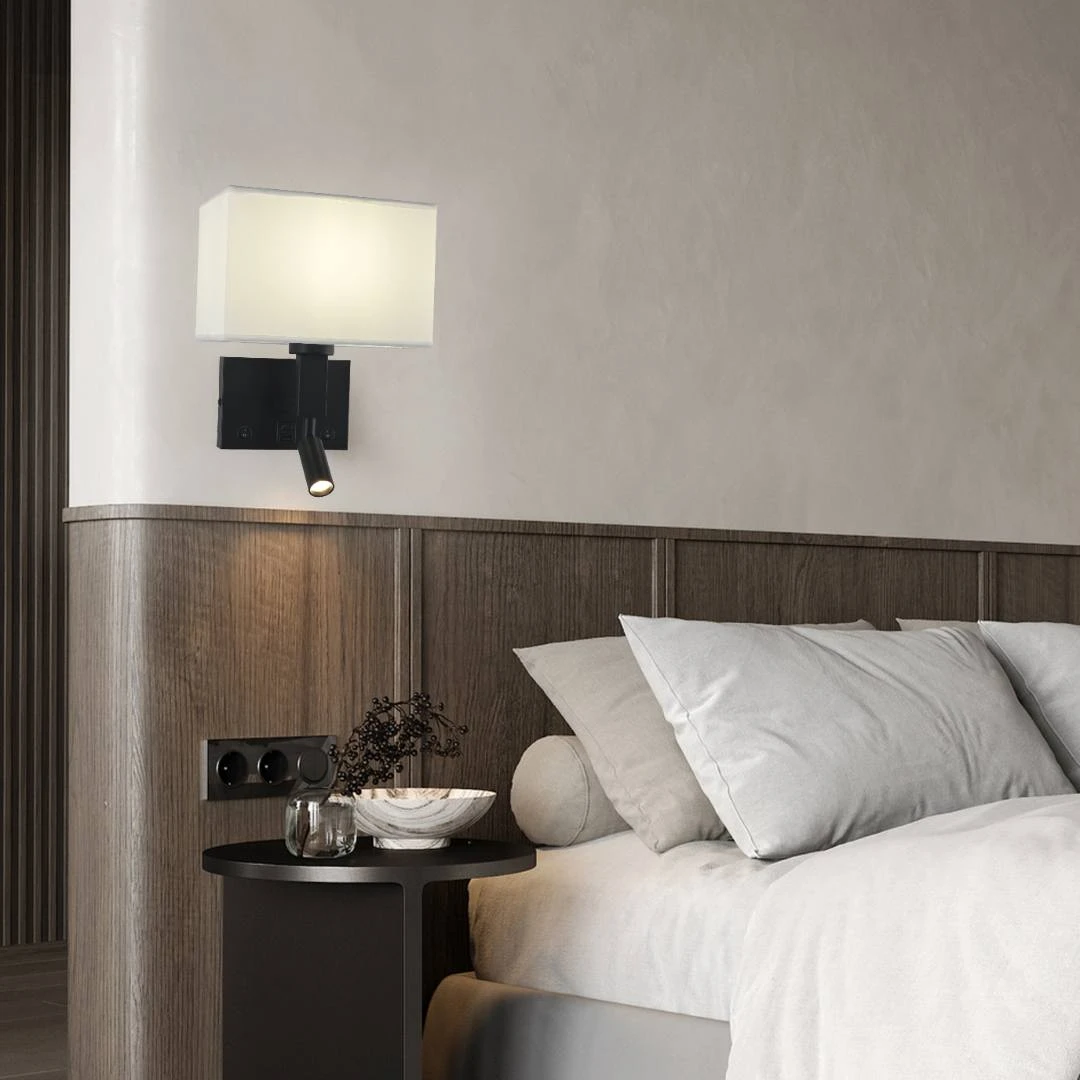 إضاءة أبليك حائط فندقي — أسود، إضاءة موجهة أصفر، مع منفذي USB وType‑C، قاعدة لمبة E14 ×1