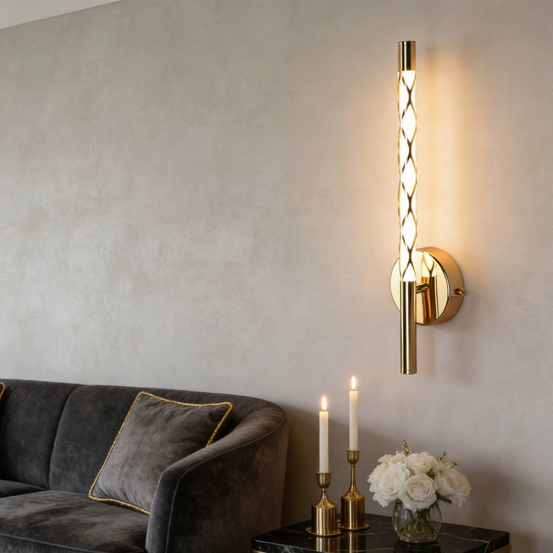 مصباح جداري داخلي يمنح إضاءة محيطية دافئة تضفي جوًا أنيقًا وعصريًا على المساحات. بتشطيب ذهبي وملمس ناعم وتصميم متقن الصنع، يضيف لمسة فاخرة لمداخل المنازل، غرف النوم، الحمامات وصالات الاستقبال.