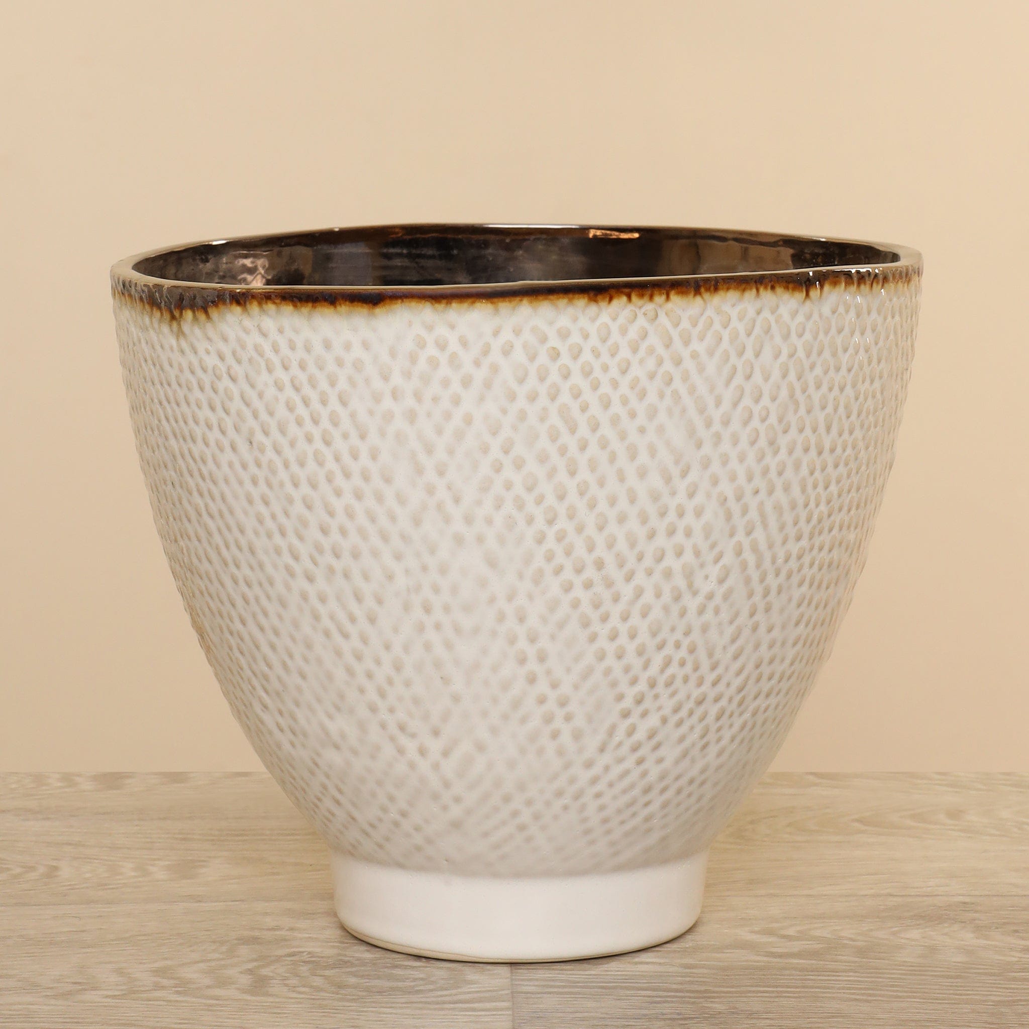 أصيص خزفي أنيق باللون الأبيض، تصميم دائري بسيط يضفي لمسة نظيفة وعصرية على أي مساحة داخلية أو خارجية.