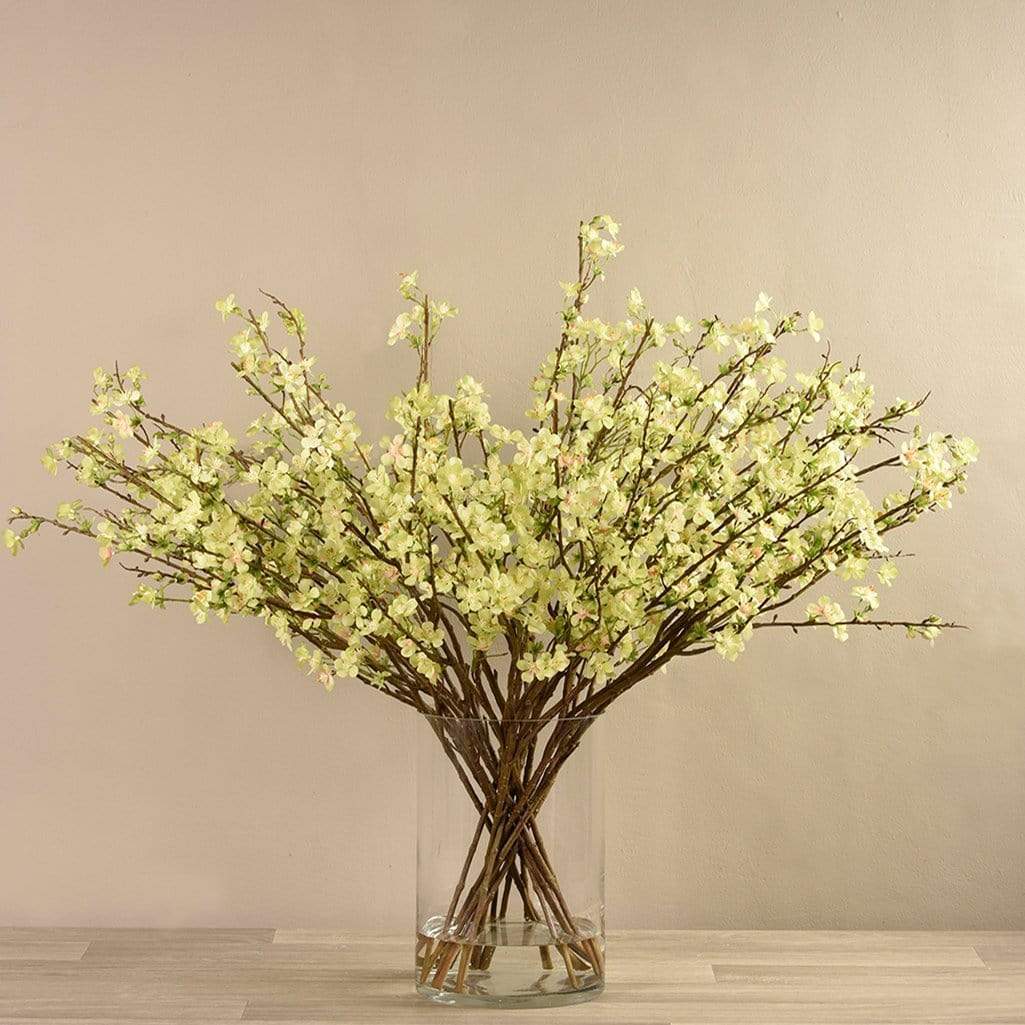 • فروع زهر أشجار صناعية مصفوفة داخل مزهرية زجاجية أنيقة.