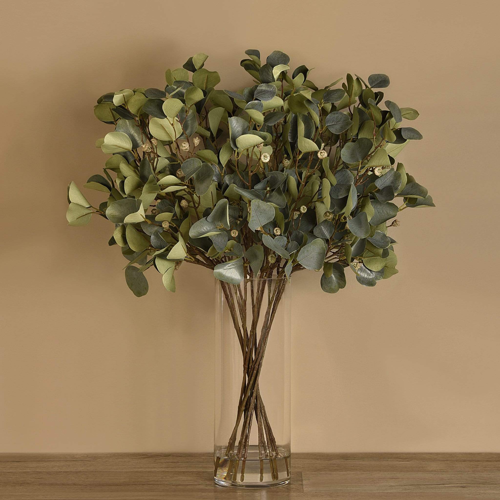 تنسيق أوكالبتوس اصطناعي أنيق يمنحك مظهراً طبيعياً يدوم لعدة مواسم—ما عدا الرائحة العطرة التي لا يملكها. موضوعة في مزهرية زجاجية عصرية، تضيف هذه القطعة لمسة خضراء ثابتة تليق بمختلف أنماط الديكور الداخلي.
