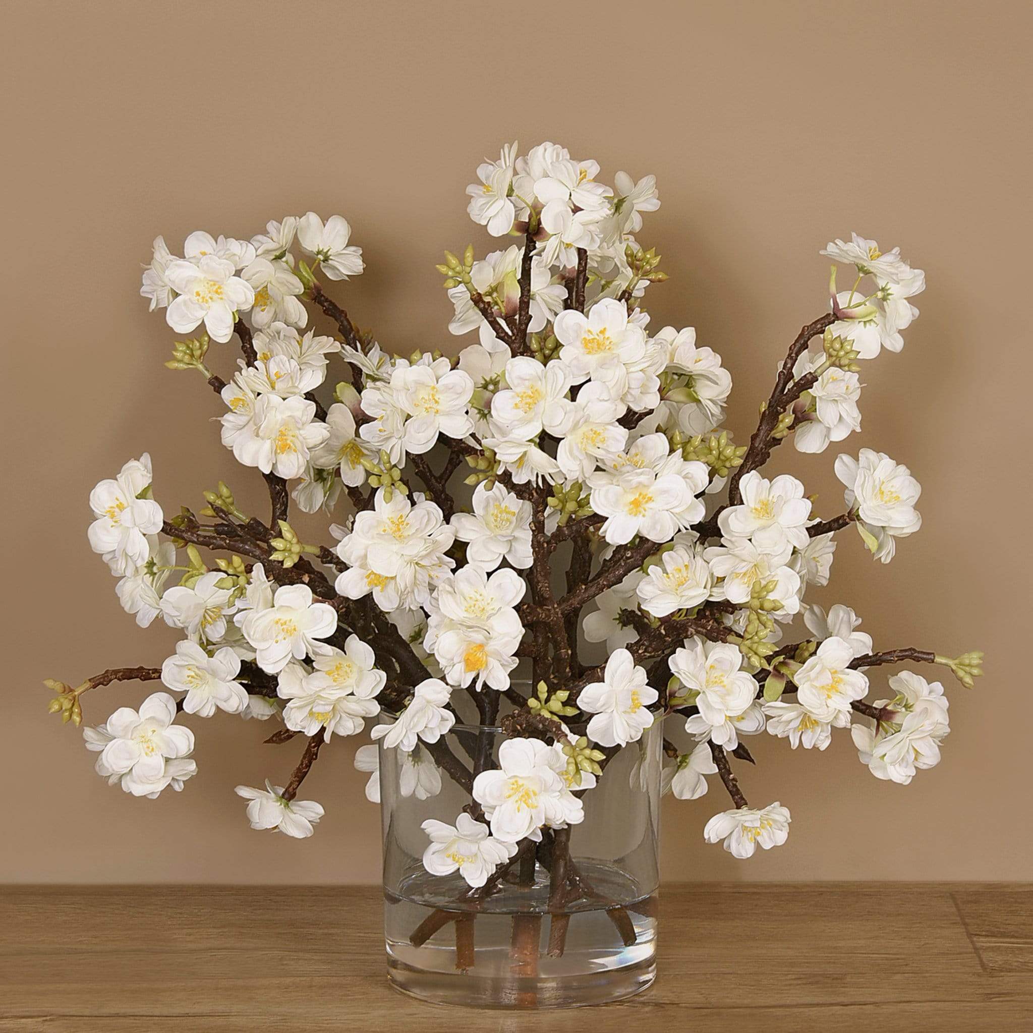 فروع الأشجار المزهرة الصناعية في مزهرية زجاجية