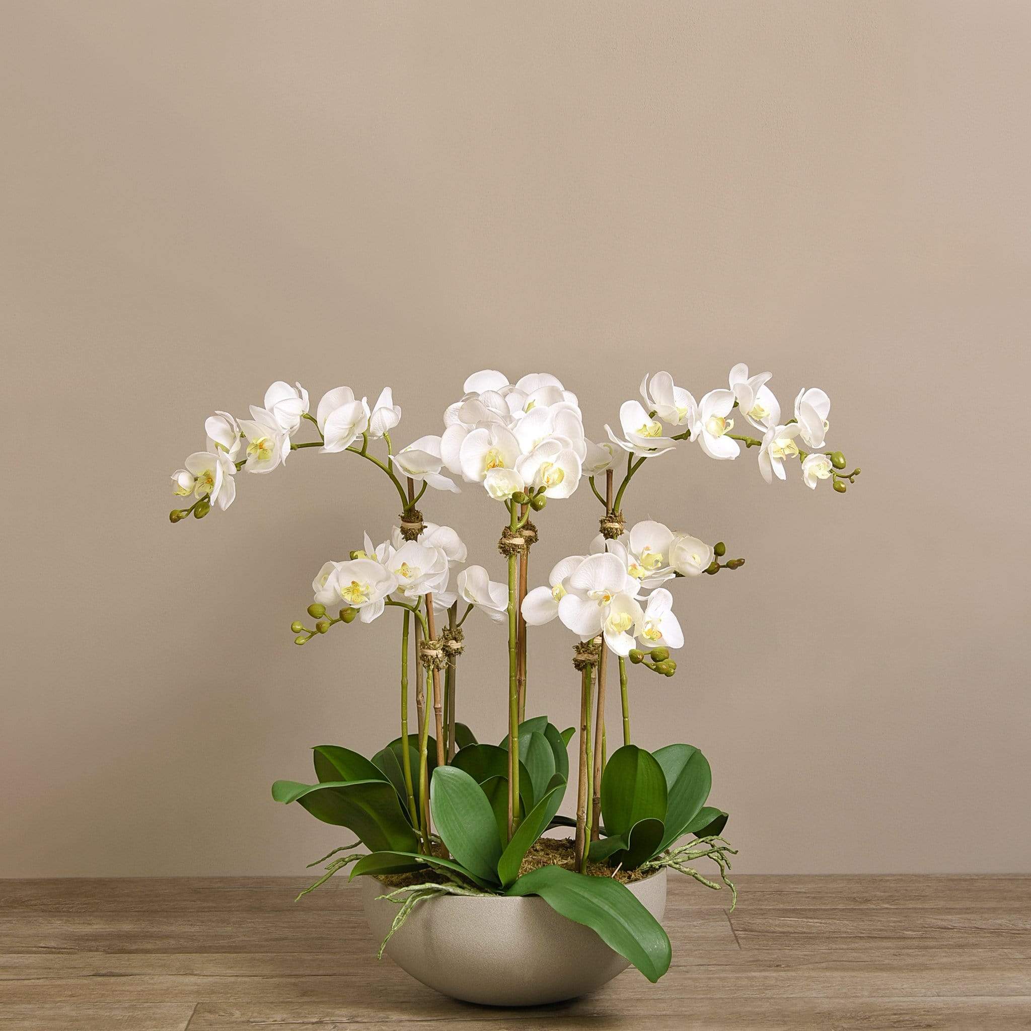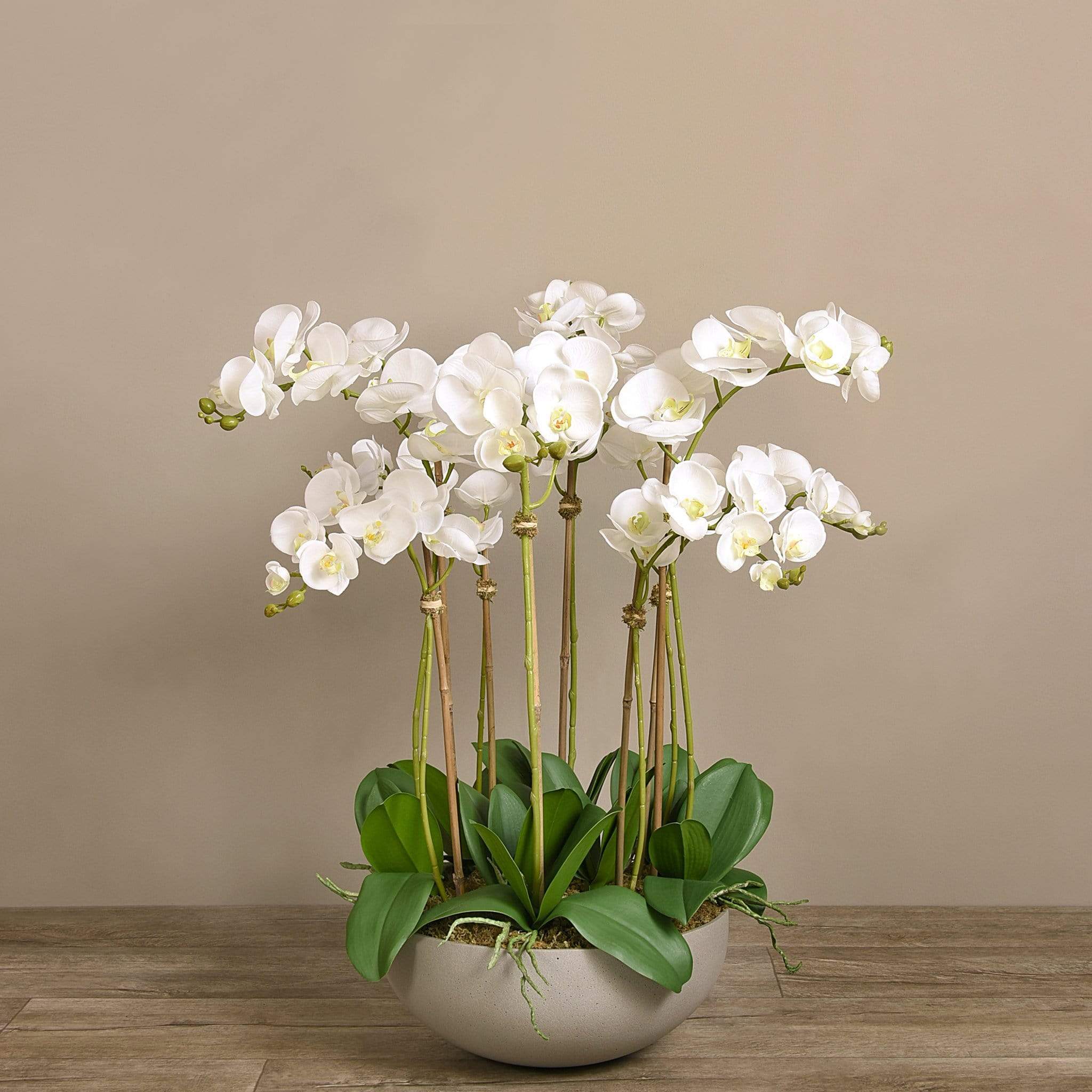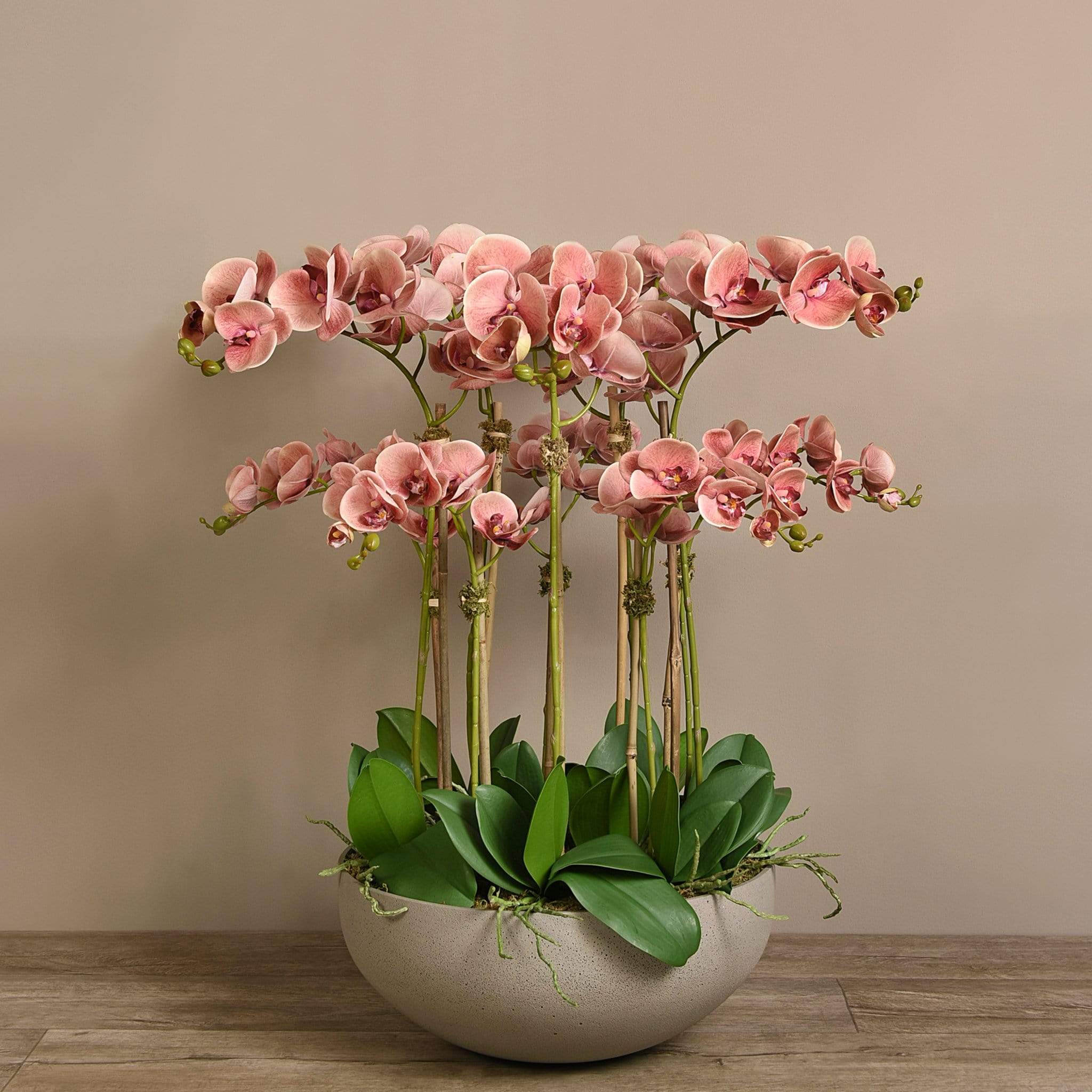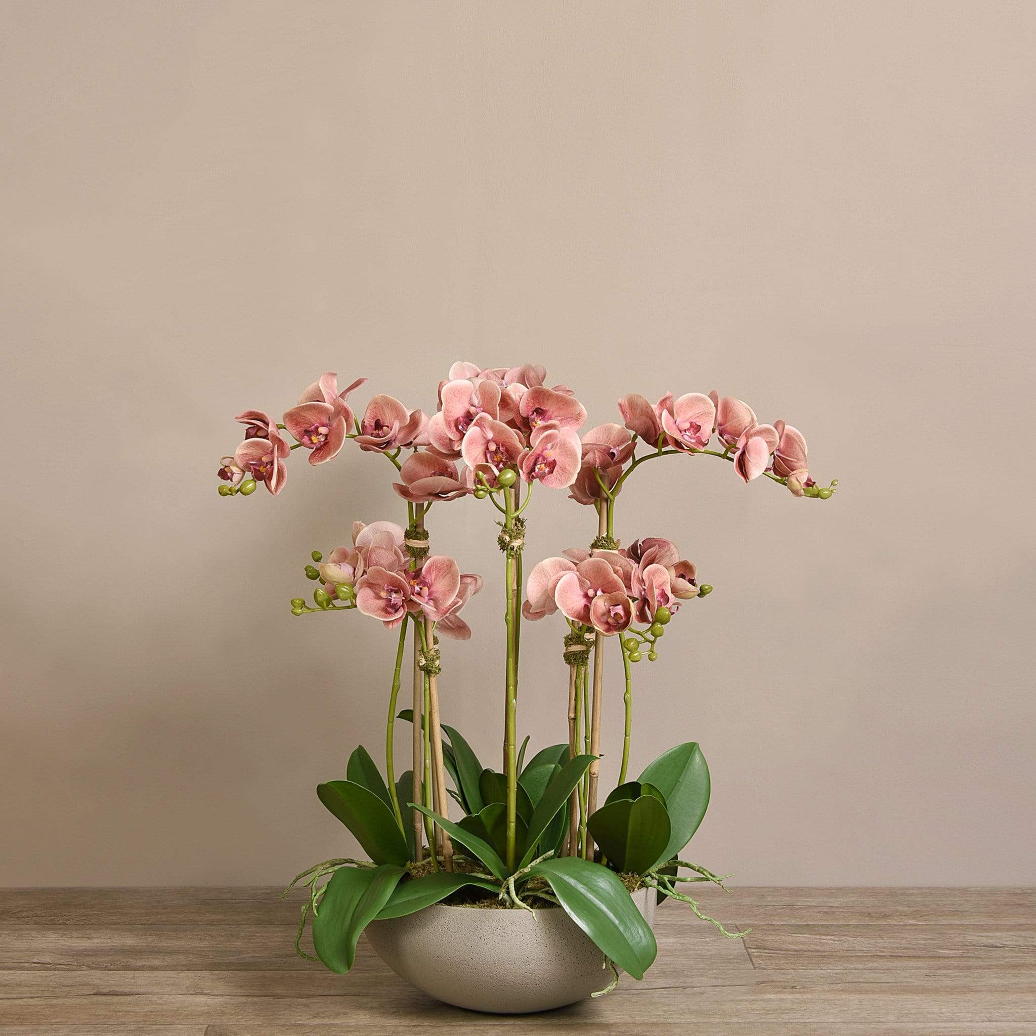 ترتيب أوركيد اصطناعي أنيق ينسجم بسلاسة مع أي ديكور داخلي. تتميز السيقان الرفيعة والزهور الدقيقة بلمسة طبيعية، بينما يمنح وعاء الحجر الرملي الملمس الناعم مظهراً راقياً ومتماشياً مع أي غرفة — بدون ذبول وبدون صيانة.