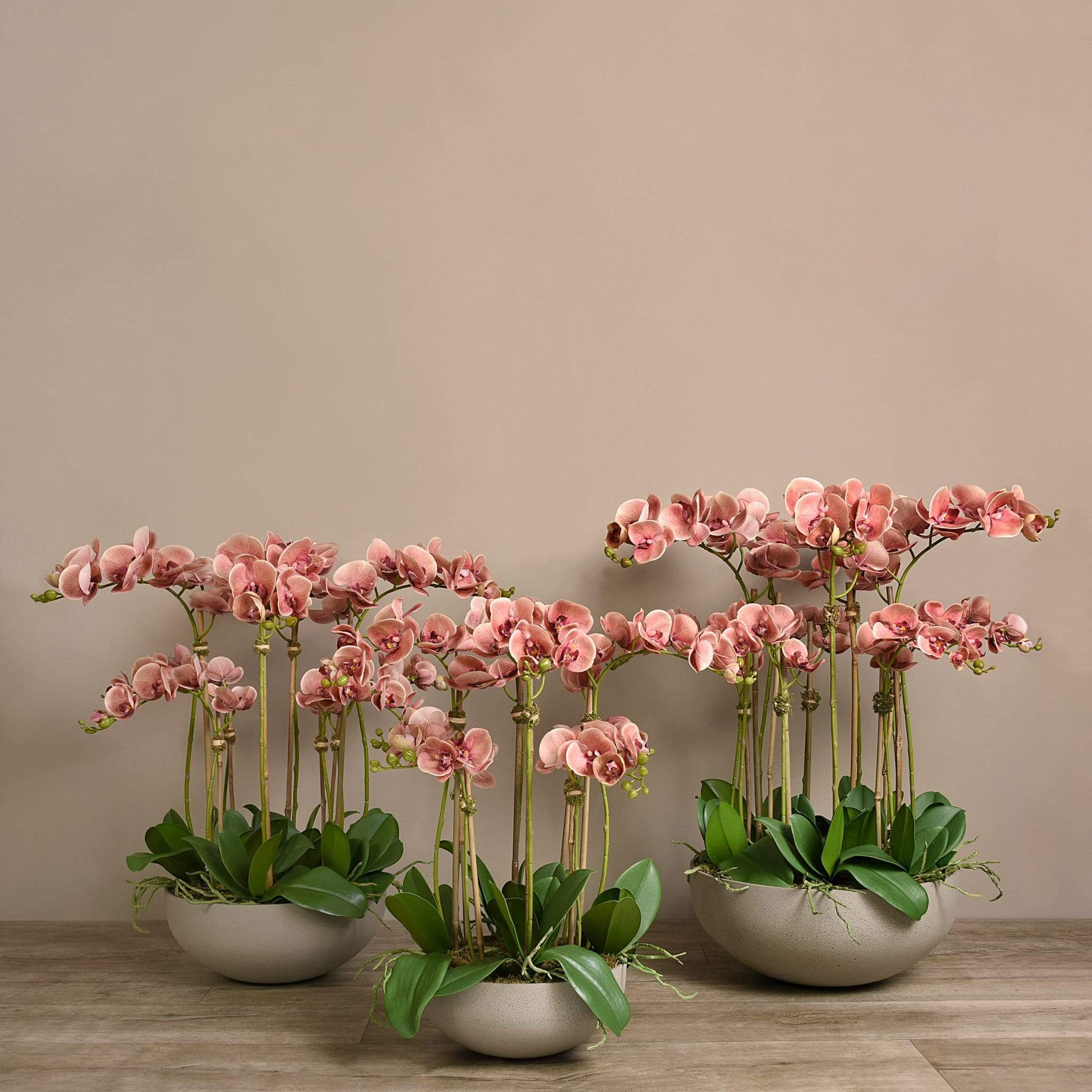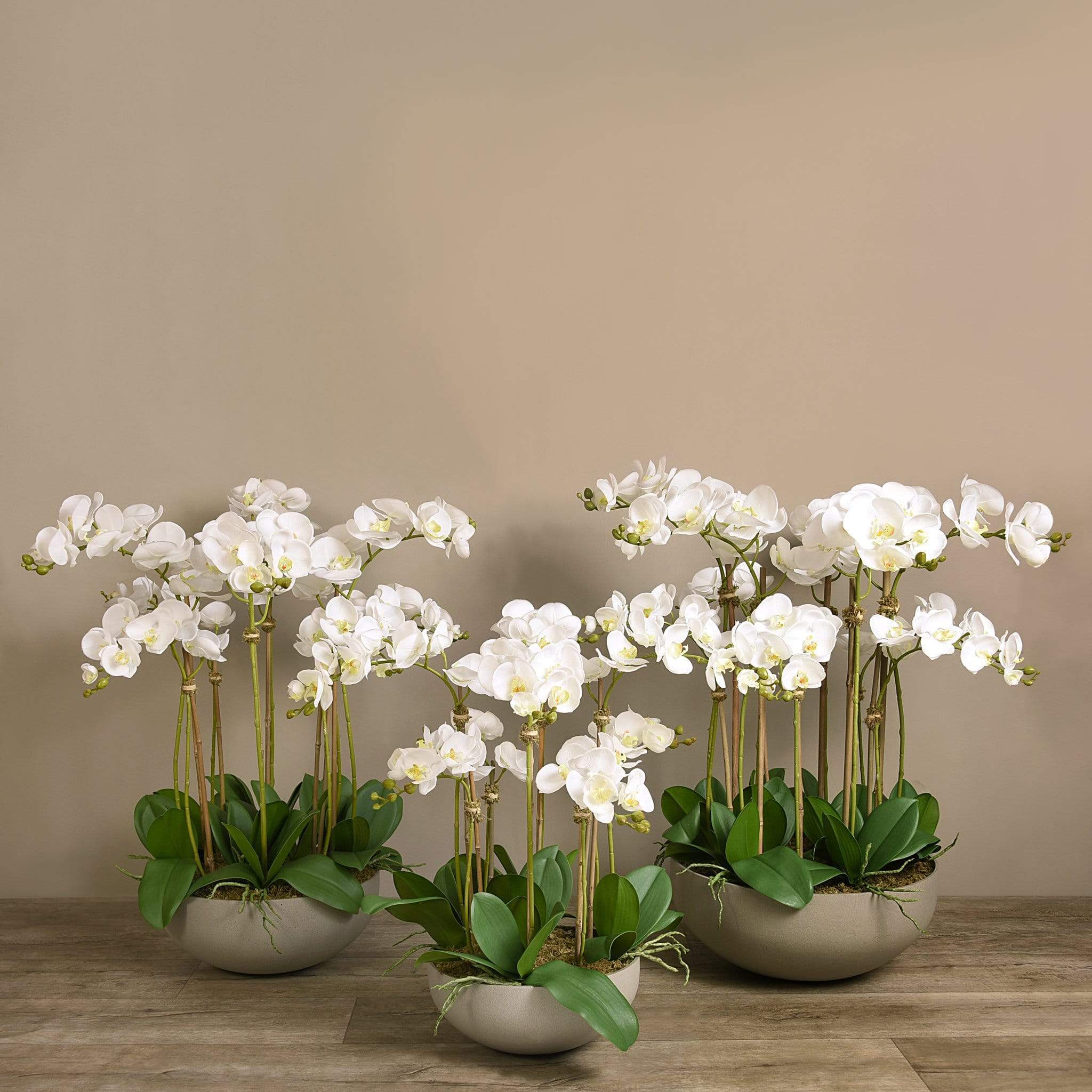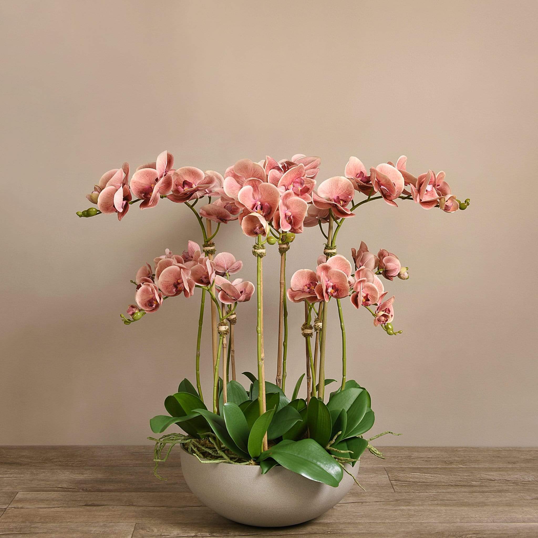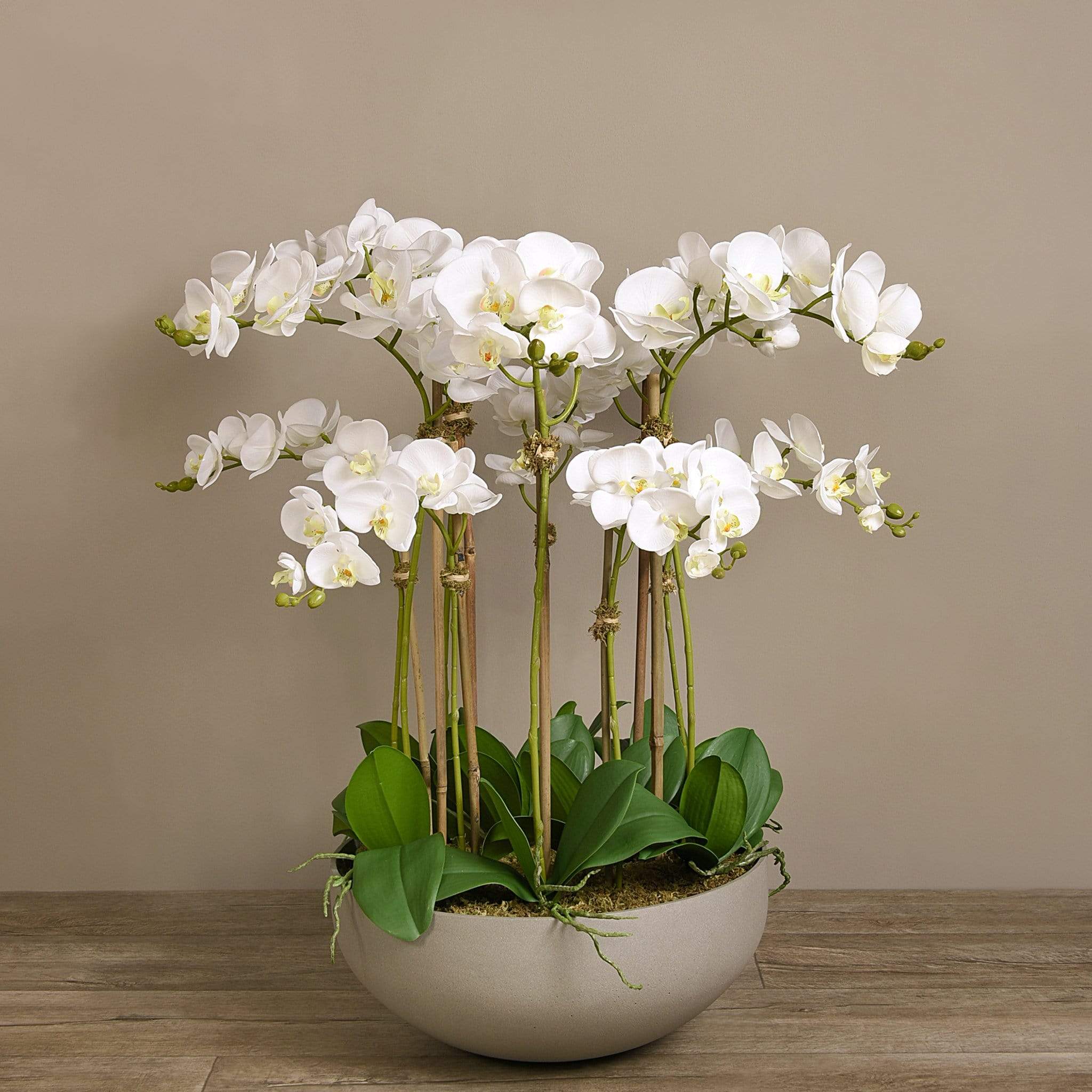 ترتيب أوركيد اصطناعي أنيق ينسجم بسلاسة مع أي ديكور داخلي. تتميز السيقان الرفيعة والزهور الدقيقة بلمسة طبيعية، بينما يمنح وعاء الحجر الرملي الملمس الناعم مظهراً راقياً ومتماشياً مع أي غرفة — بدون ذبول وبدون صيانة.