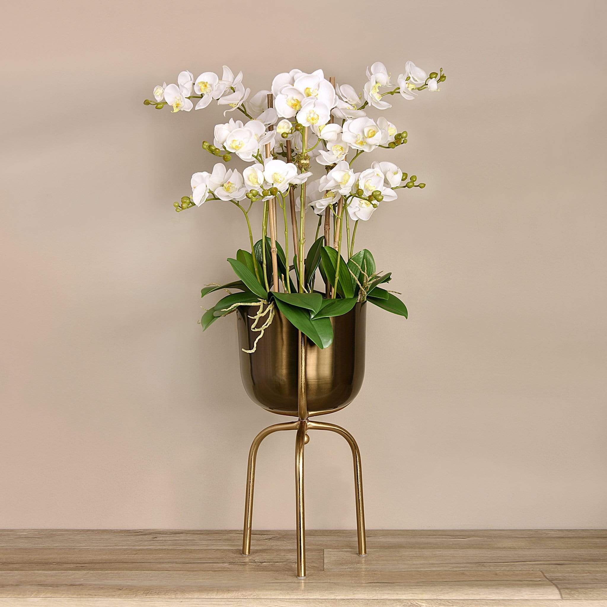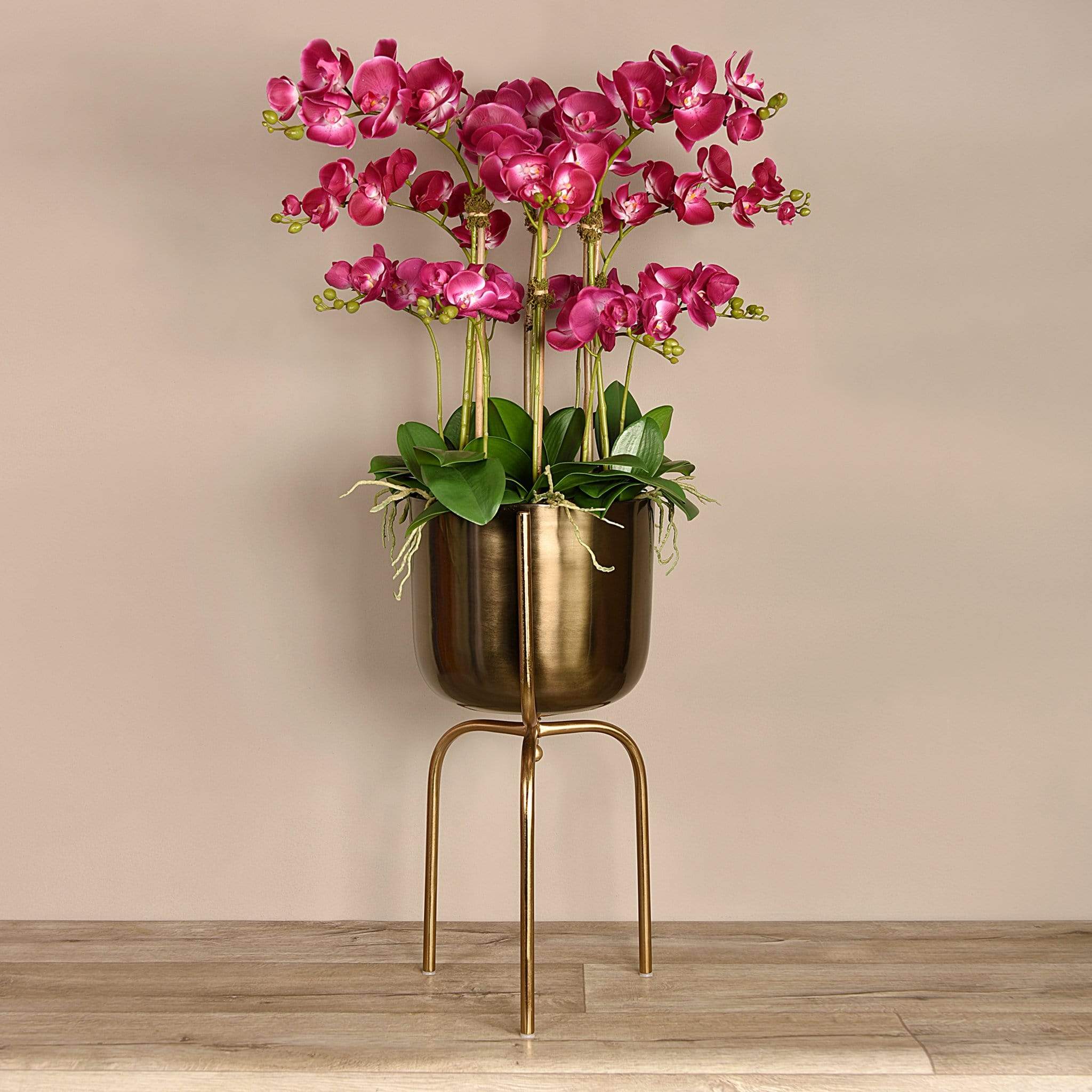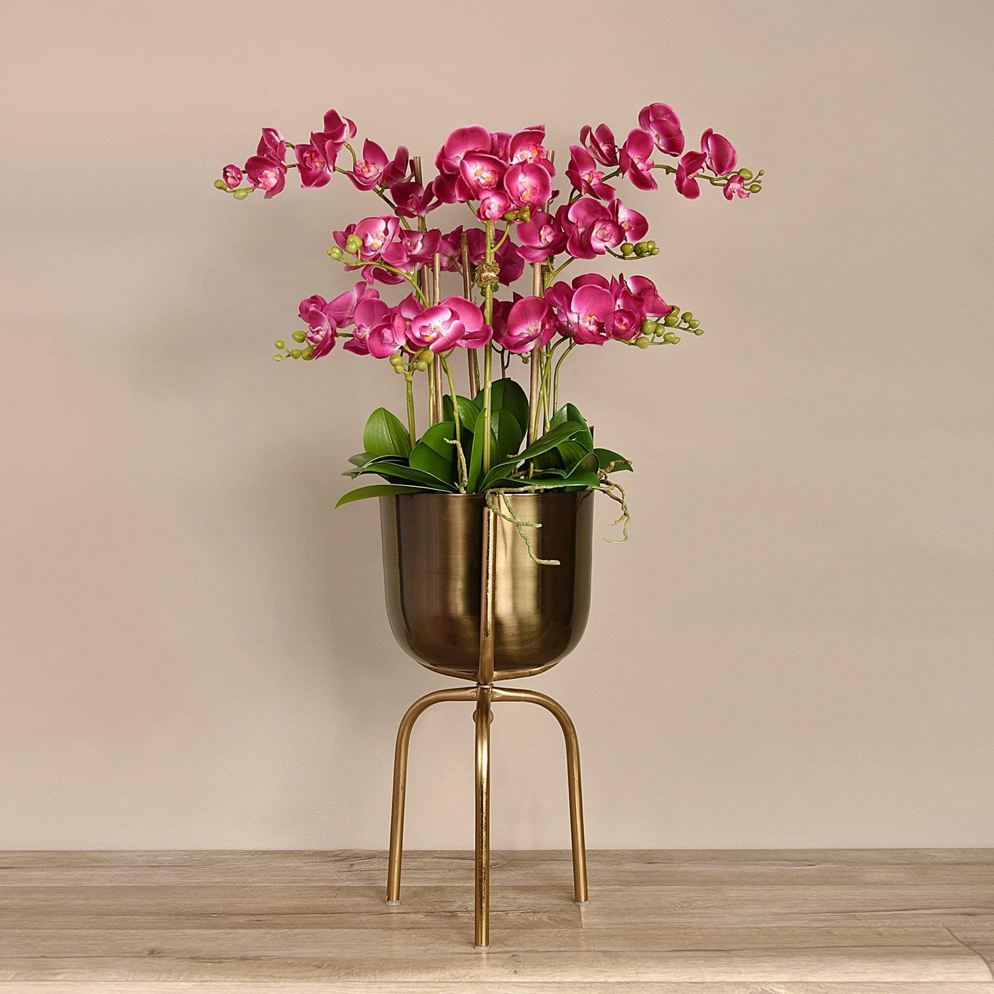 باقة أوركيد صناعي أنيقة موضوعَة داخل مزهرية ذهبية قائمة بتصميم فاخر يجذب الأنظار. الزهور مُنسقة يدويًا بعناية بواسطة خبراء تنسيق، وتتمتع بمظهر طبيعي جداً يضفي لمسة من الأناقة والديمومة على غرفة المعيشة، المكتب أو مدخل المنزل دون عناء العناية المستمرة.