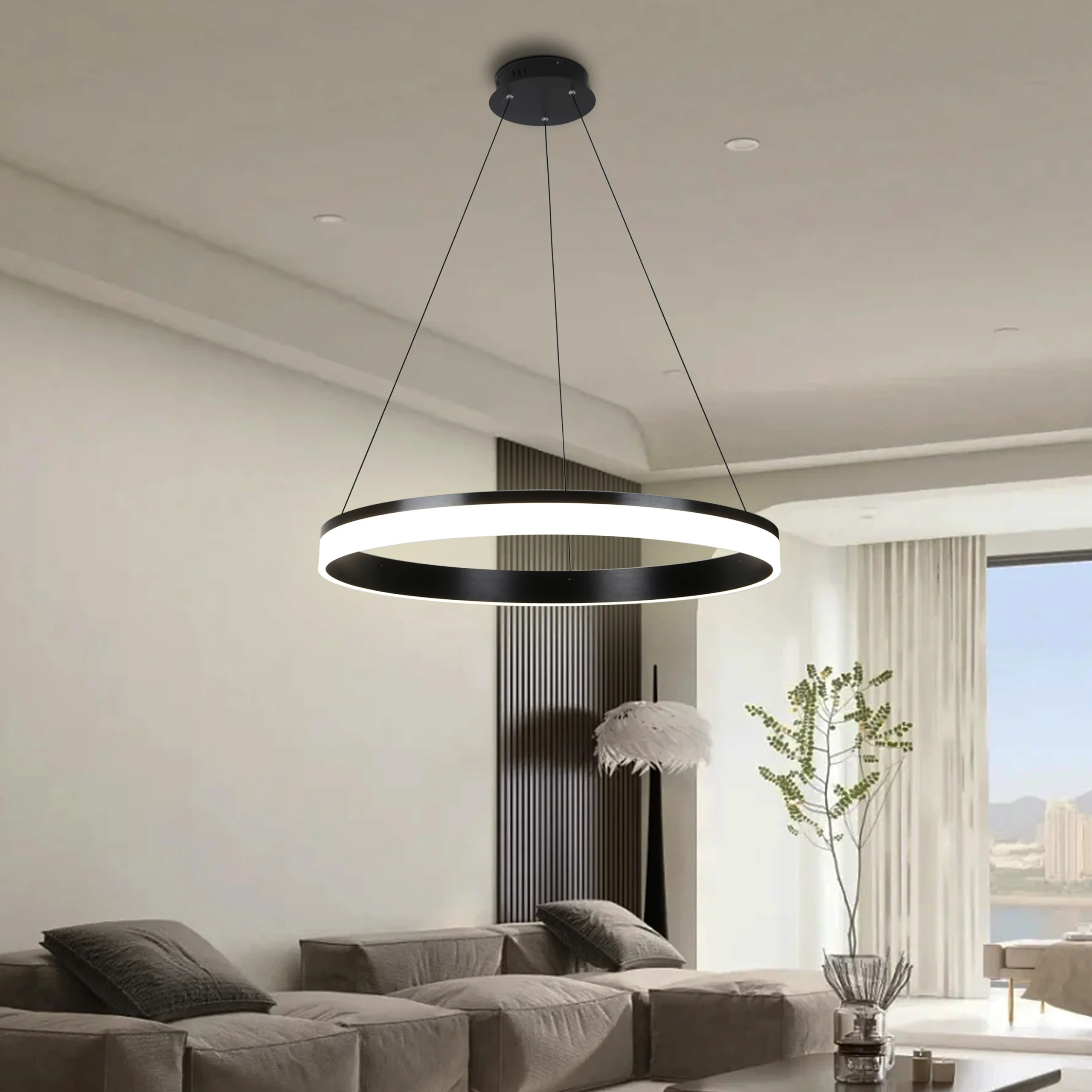 إضاءة معلّقة حديثة بتصميم حلقي أنيق، تجمع بين جمالية الشكل وكفاءة مصدر الضوء. مثالية لإضاءة غرف المعيشة، غرفة الطعام، الممرات الواسعة أو المساحات التجارية التي تحتاج مظهراً معاصراً وإضاءة قابلة للتكيف.