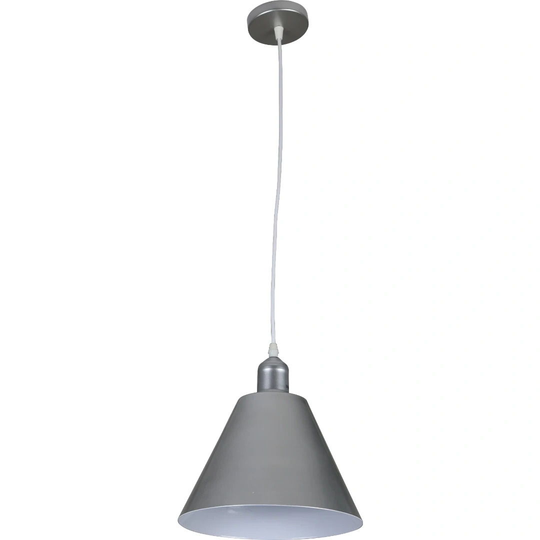 علاق معلق بتشطيب فضي ولون أبيض أنيق يغطي الموزع الضوئي. تصميمه البسيط والحديث يجعله خيارًا مناسبًا لغرف المعيشة، المطابخ، الممرات، والمقاهي. يوفر شكلًا متناغمًا مع ديكورات متعددة ويمنح إضاءة مركزة ومتوازنة.
