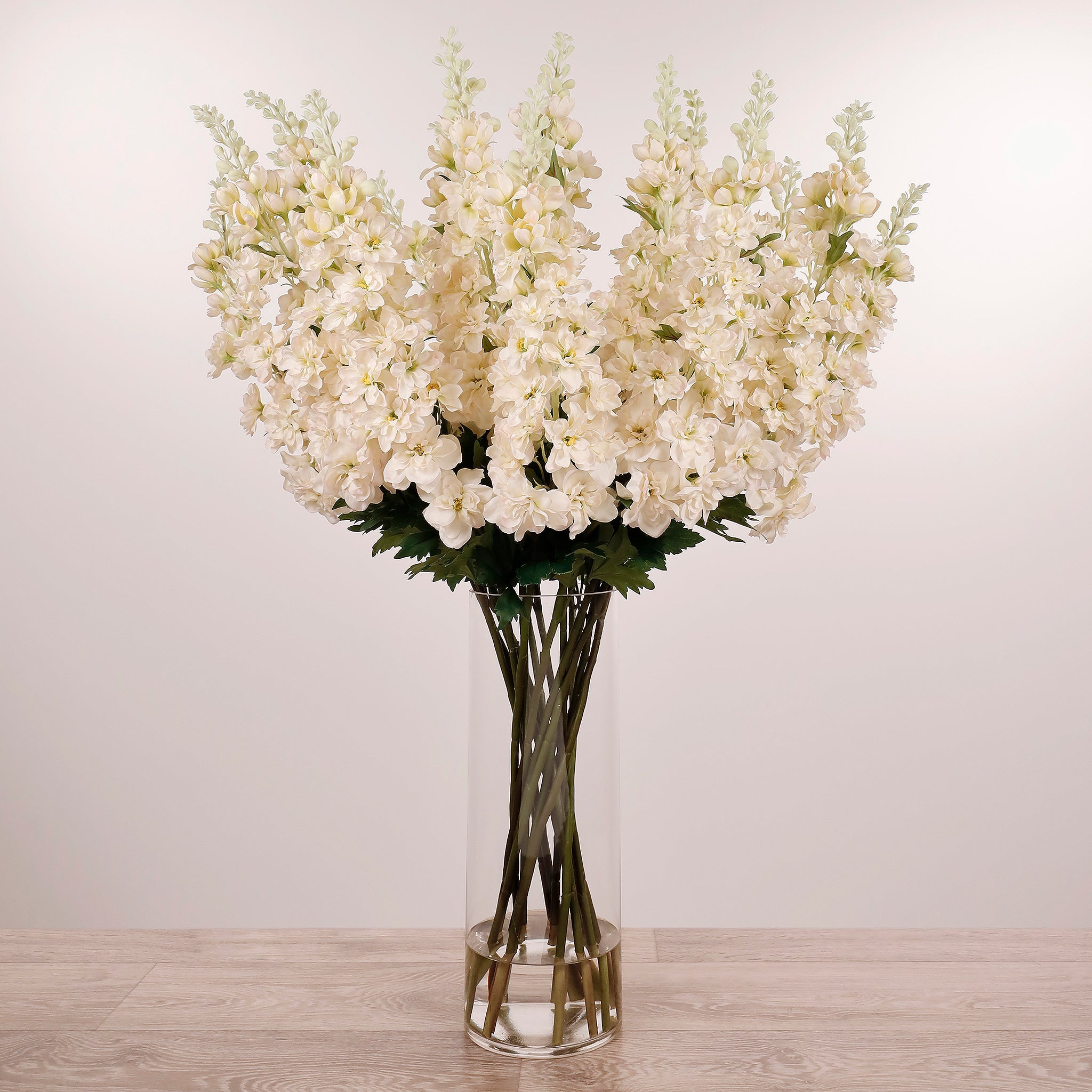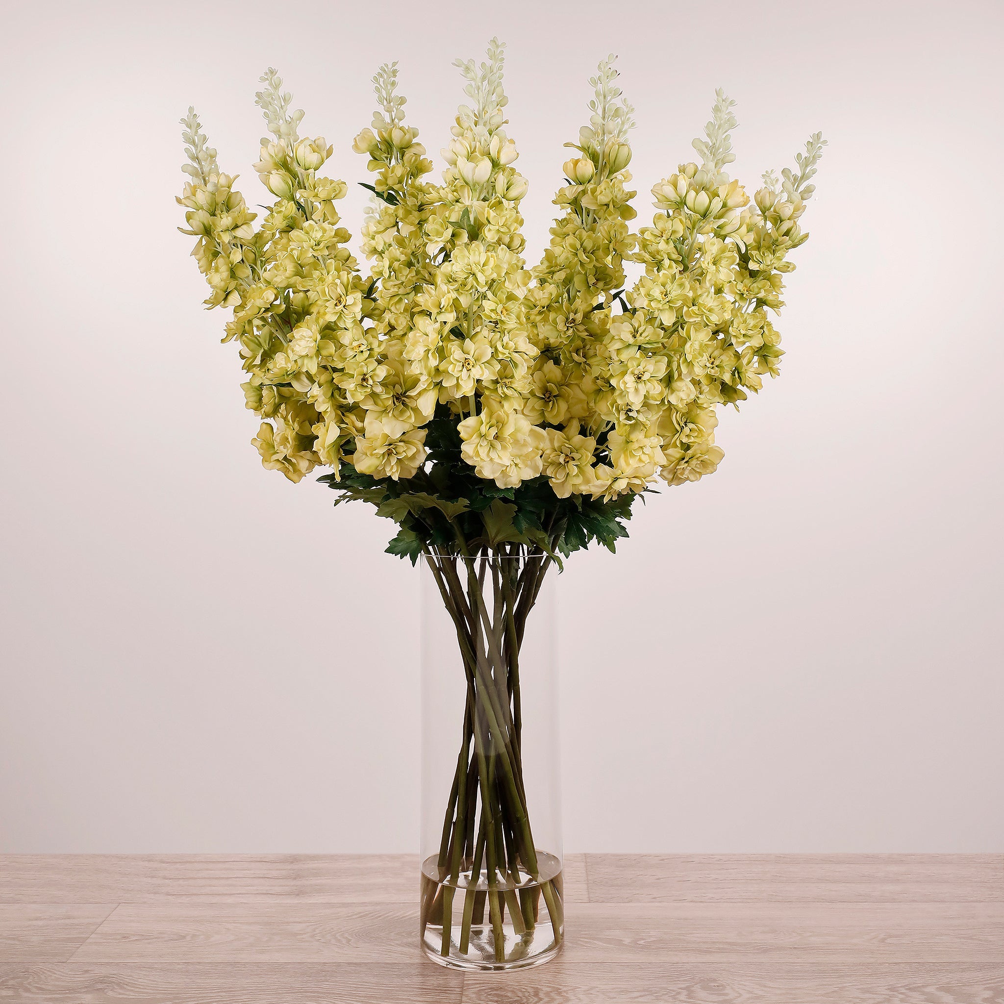 تشكيلة أنيقة من أزهار دلفيون الصناعية موضوعة في مزهرية زجاجية شفافة — مظهر طبيعي جذاب يضيف لمسة من الرقي لأي مكان من دون عناء العناية اليومية. بتلات واقعية ولون نابض بالحياة مرتبة بعناية لخلق تنسيق ثابت يدوم طويلاً.