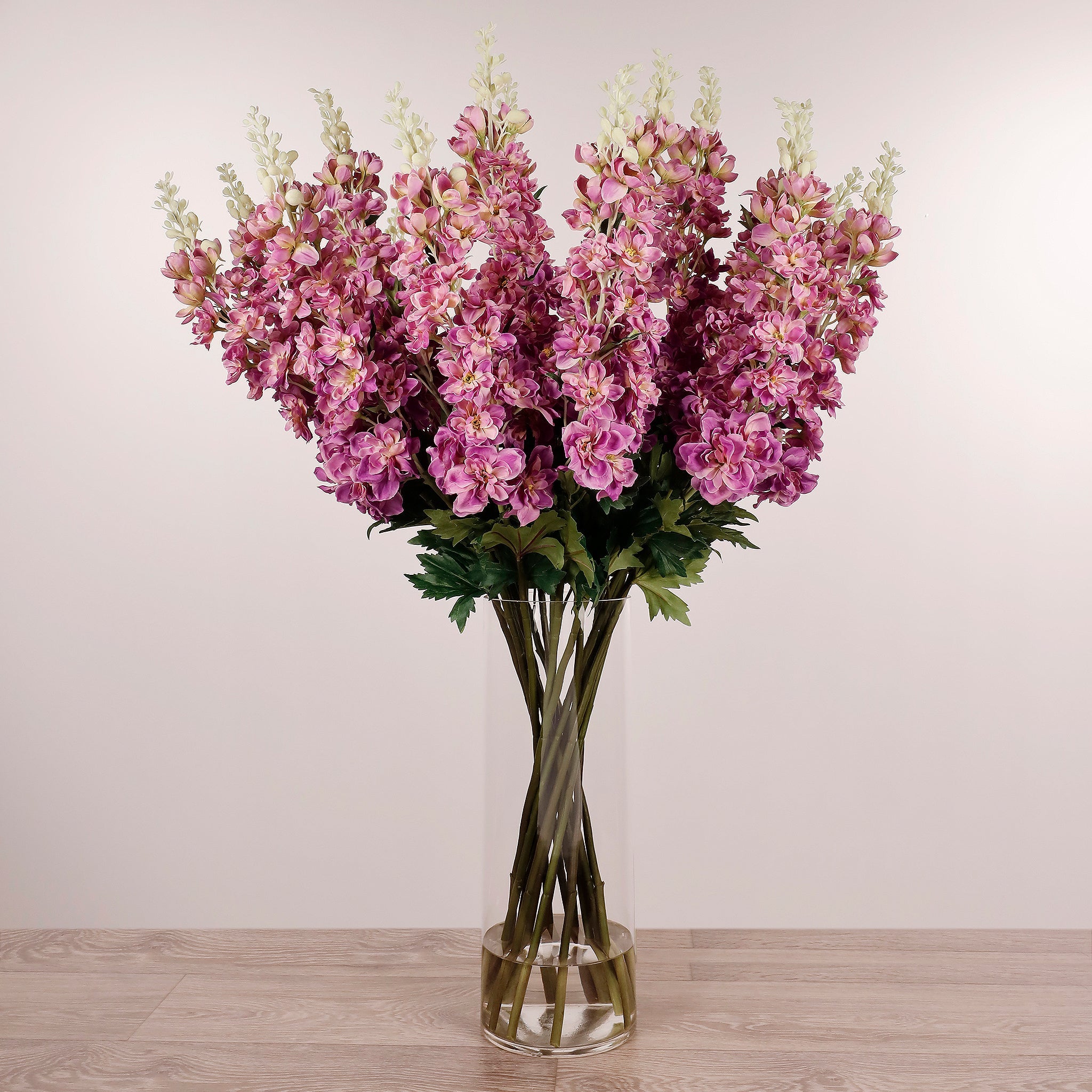 - تنسيق أزهار دلفيون صناعية مثبتة في مزهرية زجاجية