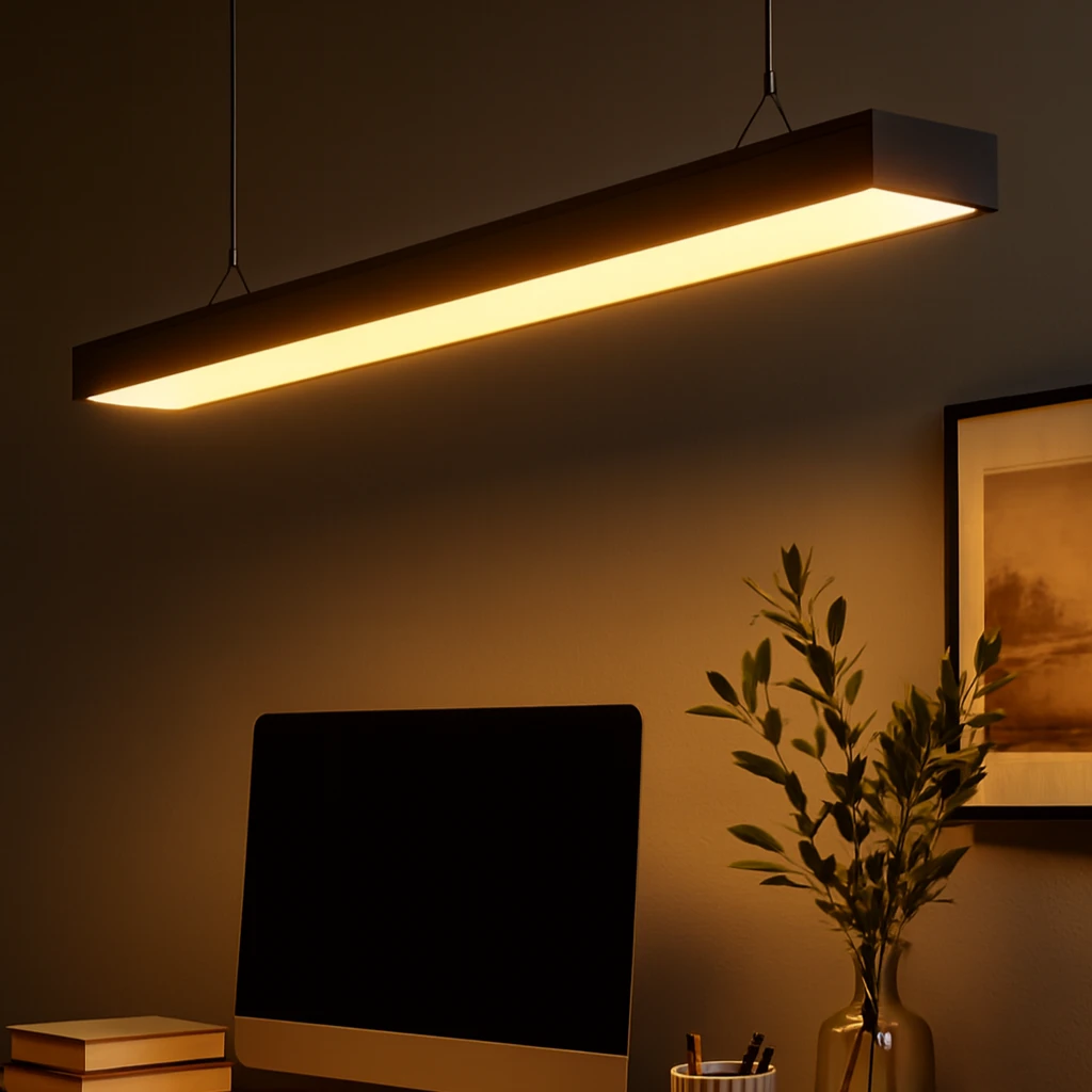 كشاف مكتبي عصري بقوة 60 واط وطول 120 سم، غطاء خارجي أسود ولون إضاءة أصفر. مناسب للاستخدام كمصباح معلق أو تثبيت سطحي (لطش)، يوفر إضاءة متجانسة لمساحات العمل والمكاتب.