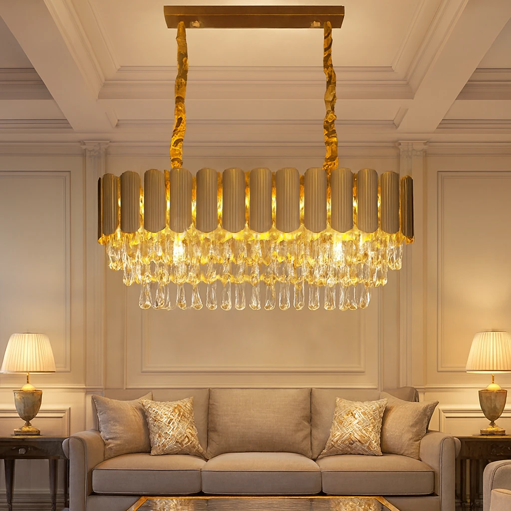 إضاءة كريستالية أوروبية تجمع بين الفخامة والحداثة لتضفي رونقاً متميزاً على الصالون، غرفة الطعام أو المدخل الكبير.