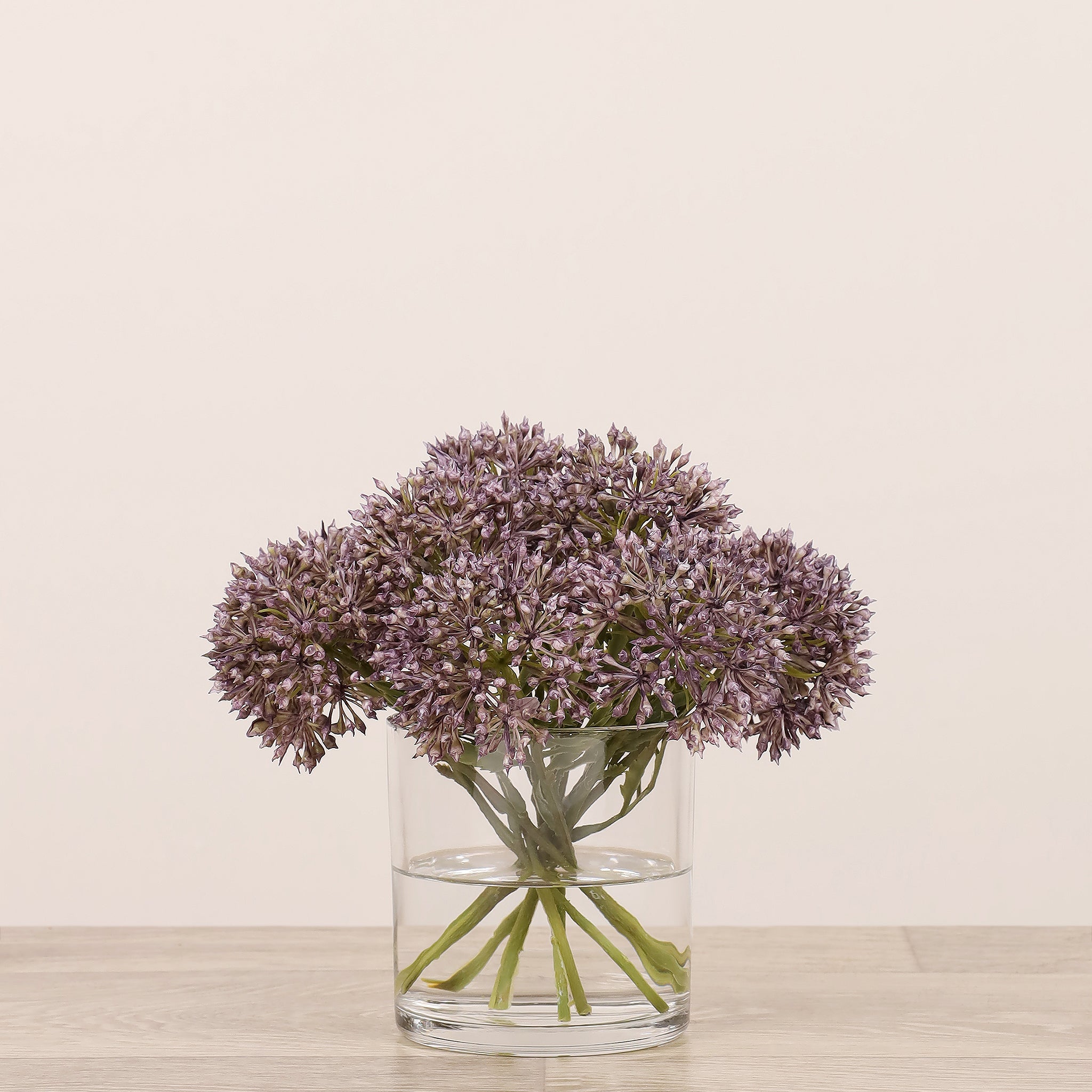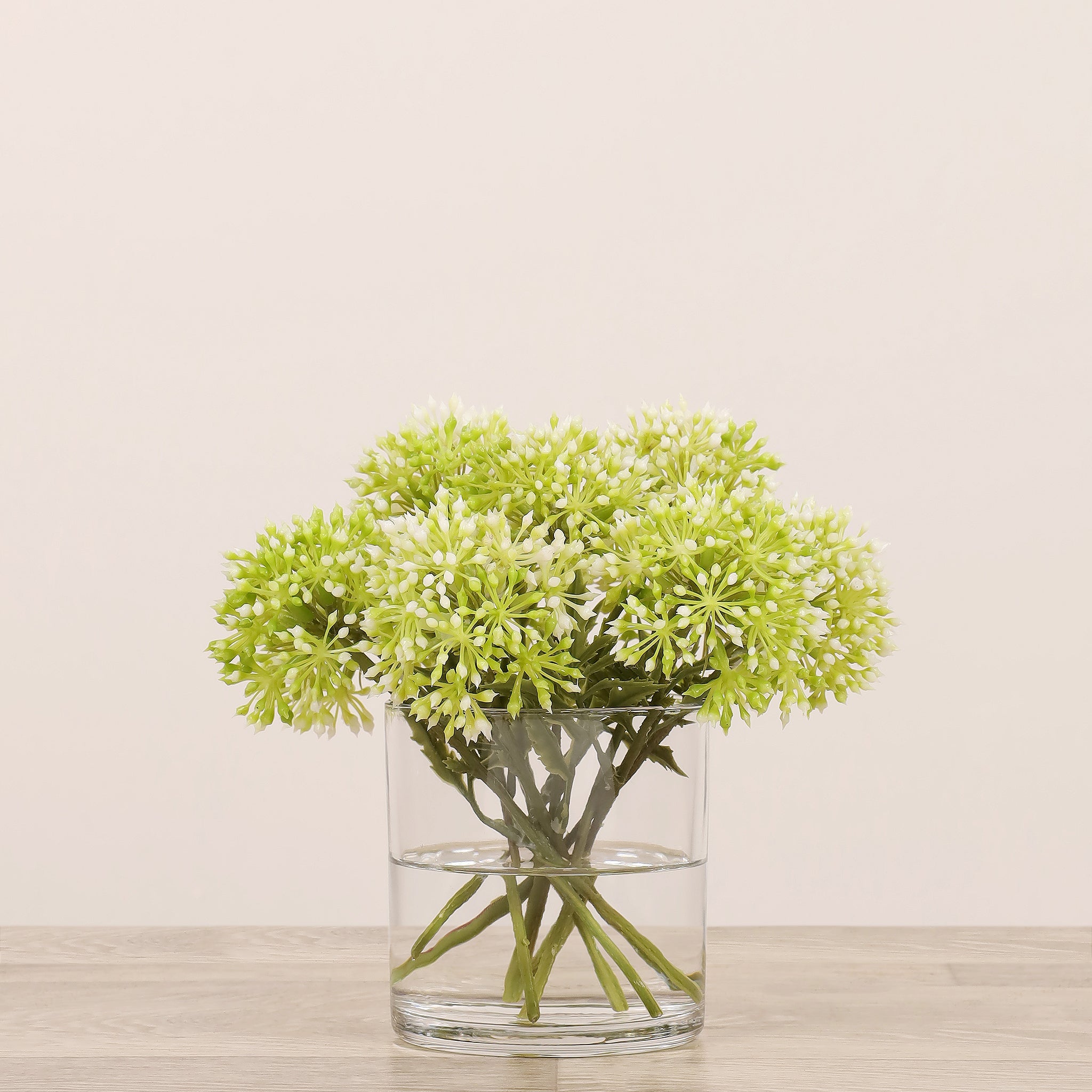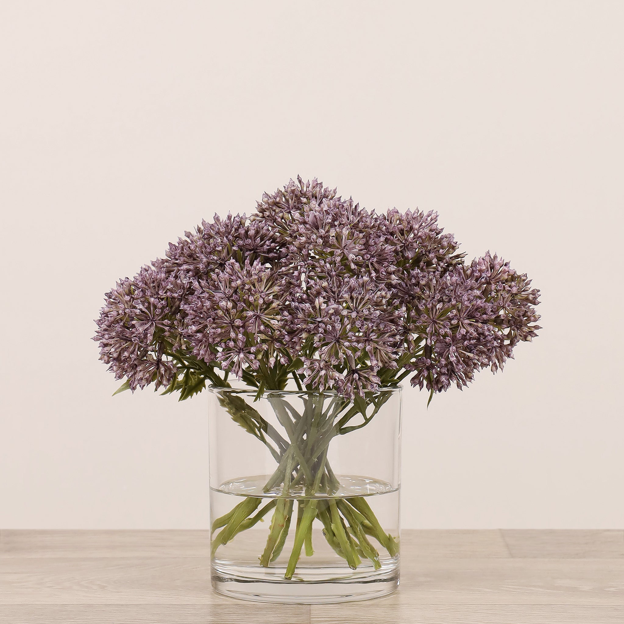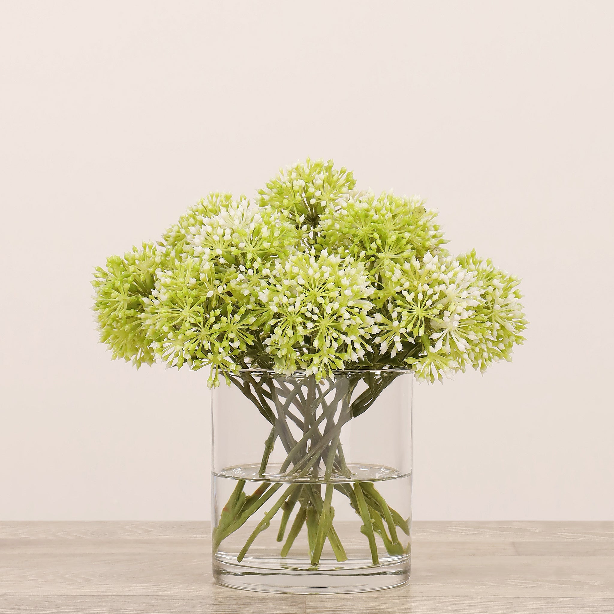 أضف لمسة أناقة وهدوء إلى منزلك أو مكتبك مع تنسيق أليوم الصناعي المصمم بعناية والمركون في مزهرية زجاجية شفافة. مظهره الطبيعي وتفاصيله الدقيقة تمنح المكان شعورًا بالانسجام دون حاجة إلى صيانة مستمرة.