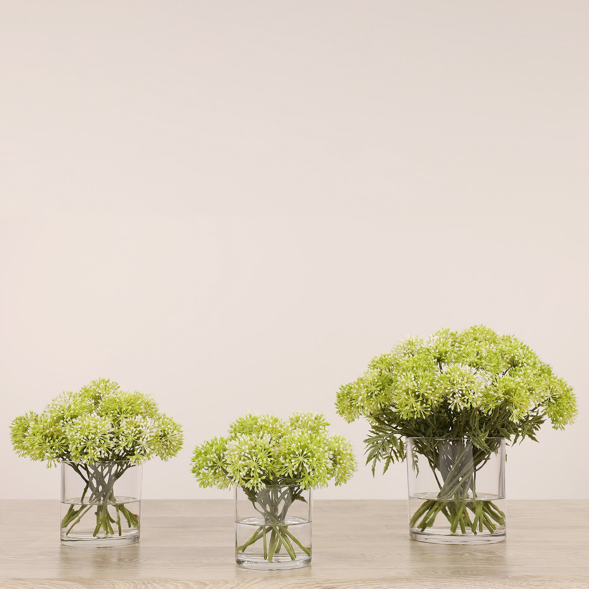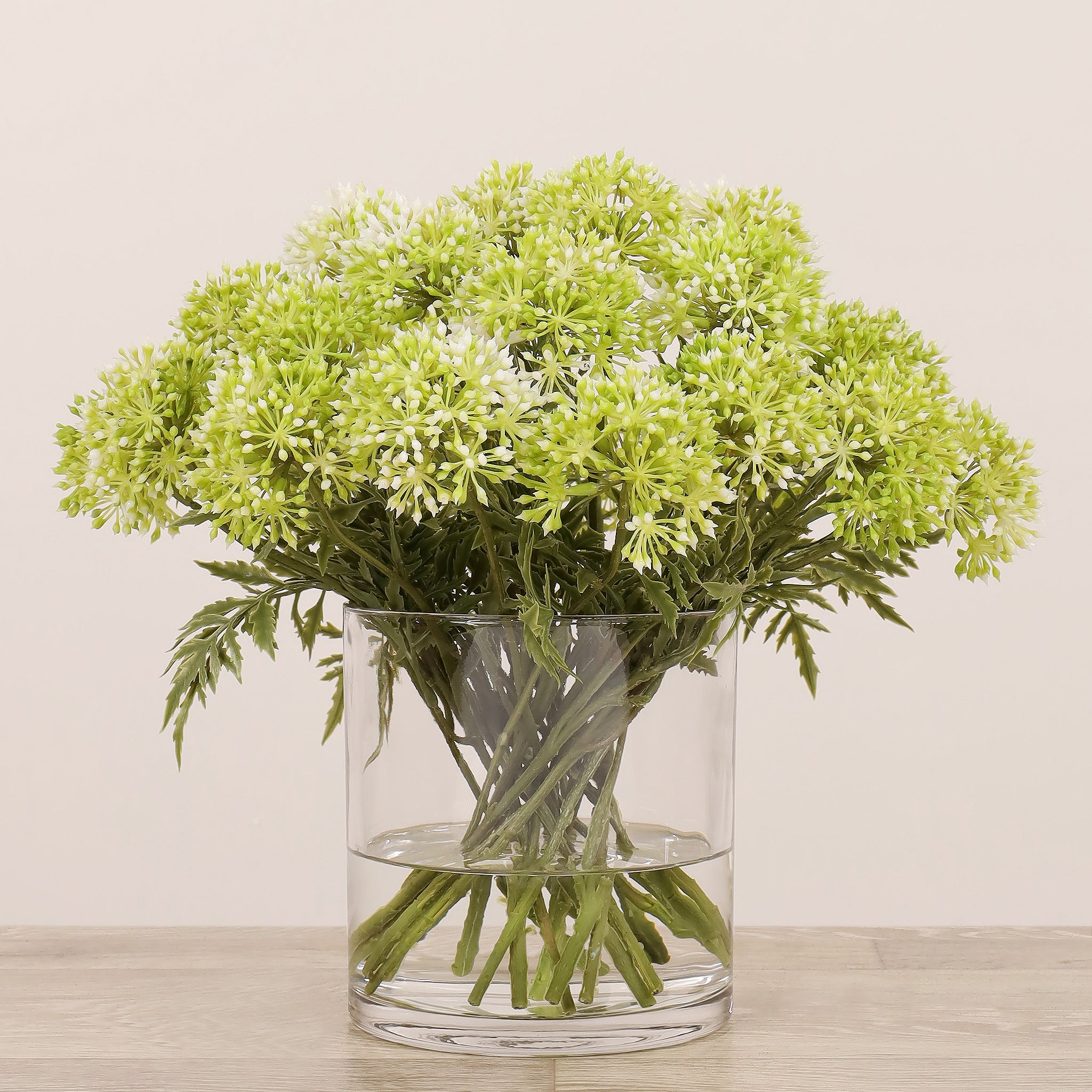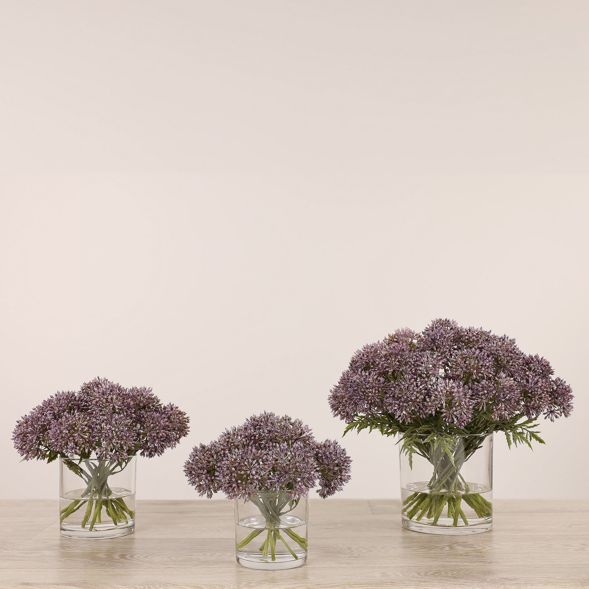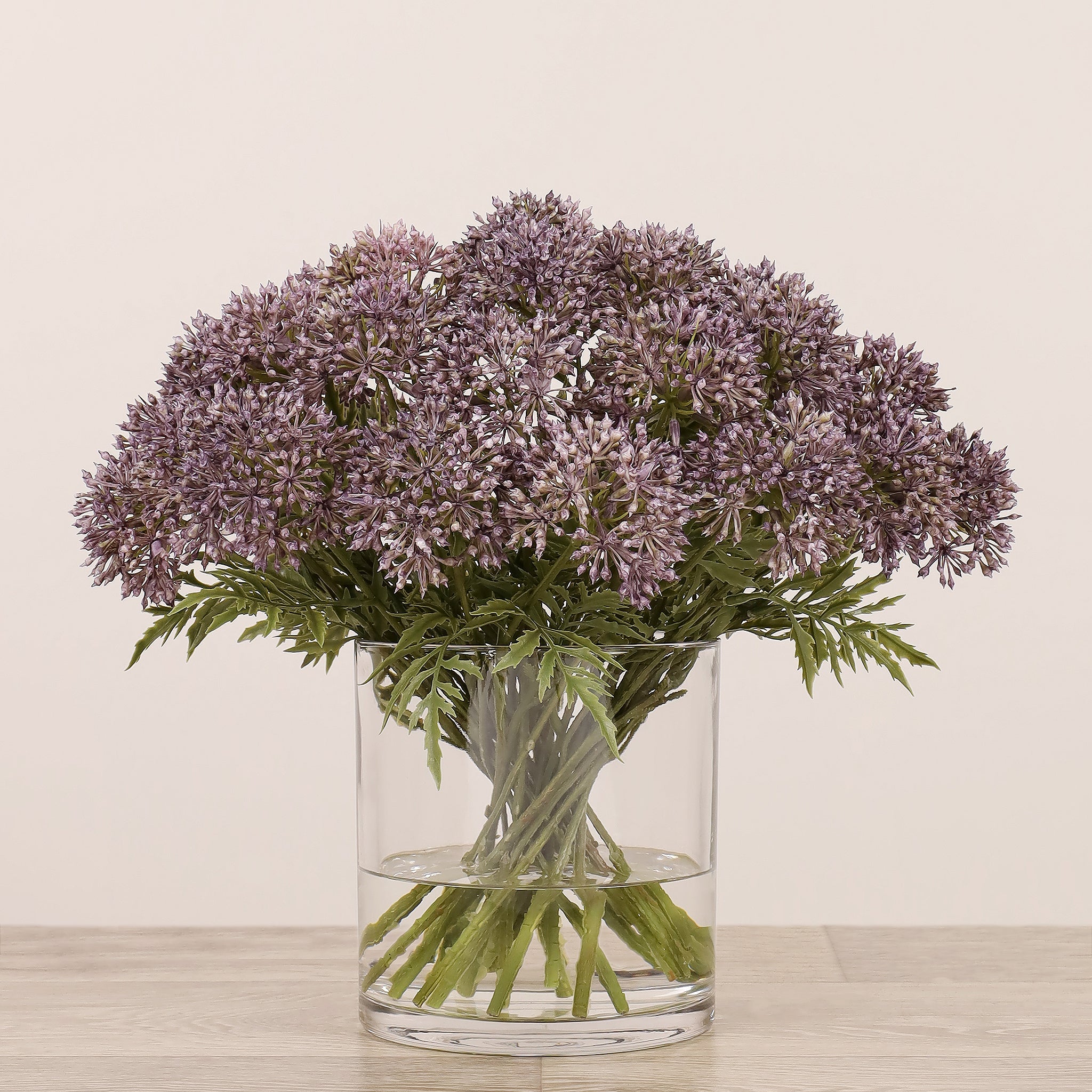 أضف لمسة أناقة وهدوء إلى منزلك أو مكتبك مع تنسيق أليوم الصناعي المصمم بعناية والمركون في مزهرية زجاجية شفافة. مظهره الطبيعي وتفاصيله الدقيقة تمنح المكان شعورًا بالانسجام دون حاجة إلى صيانة مستمرة.