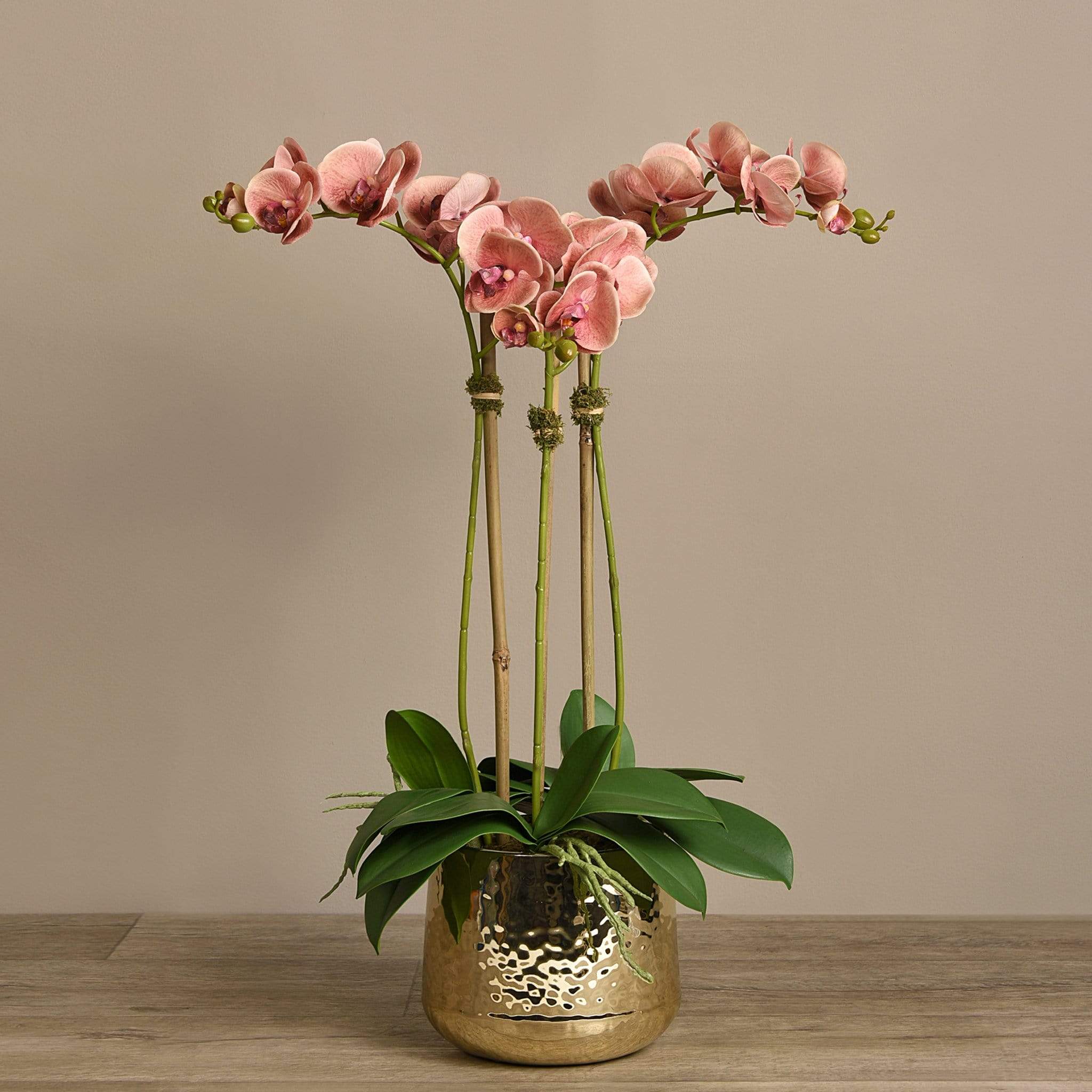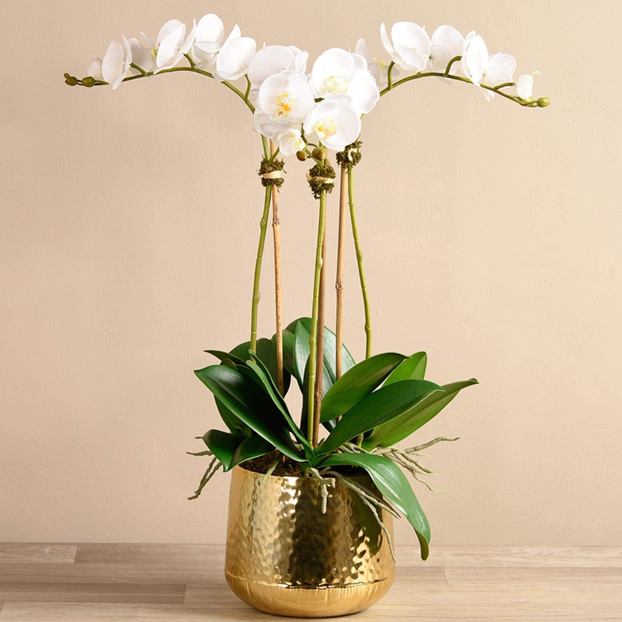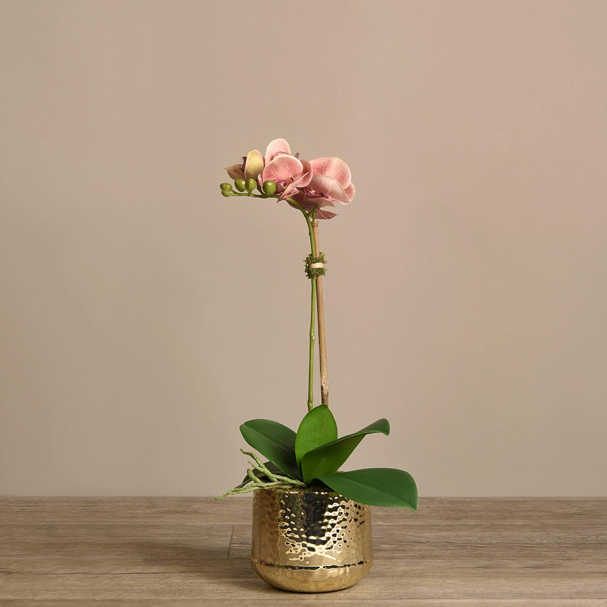 تضفي باقة الأوركيد الباريسية الصناعية لمسة من الأناقة الباريسية على أي مساحة. تتألف التشكيلة من أوركيدات حريرية متقنة الصنع مرتبة بعناية داخل مزهرية سيراميكية بلون ذهبي لامع، لتصبح قطعة ديكور راقية تلفت الأنظار وتثري الأجواء بلمسة من الفخامة.