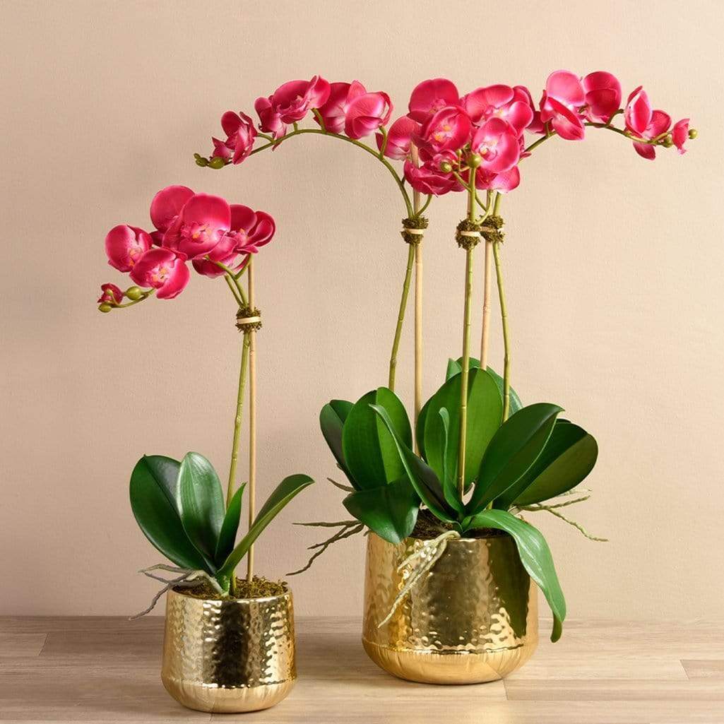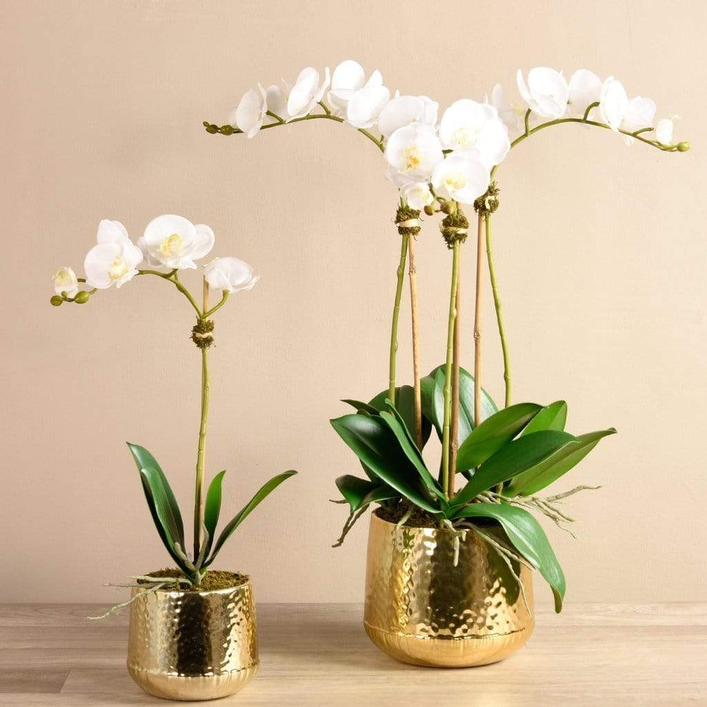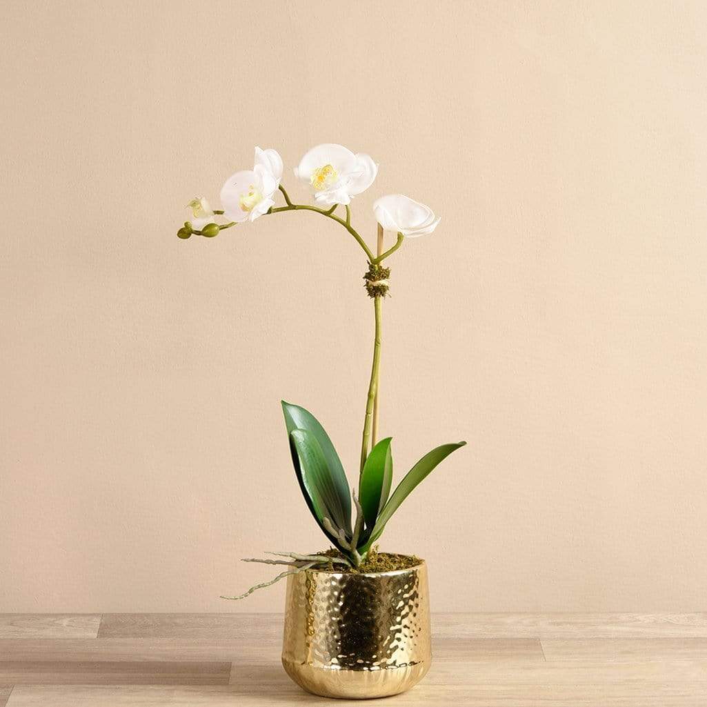 تضفي باقة الأوركيد الباريسية الصناعية لمسة من الأناقة الباريسية على أي مساحة. تتألف التشكيلة من أوركيدات حريرية متقنة الصنع مرتبة بعناية داخل مزهرية سيراميكية بلون ذهبي لامع، لتصبح قطعة ديكور راقية تلفت الأنظار وتثري الأجواء بلمسة من الفخامة.