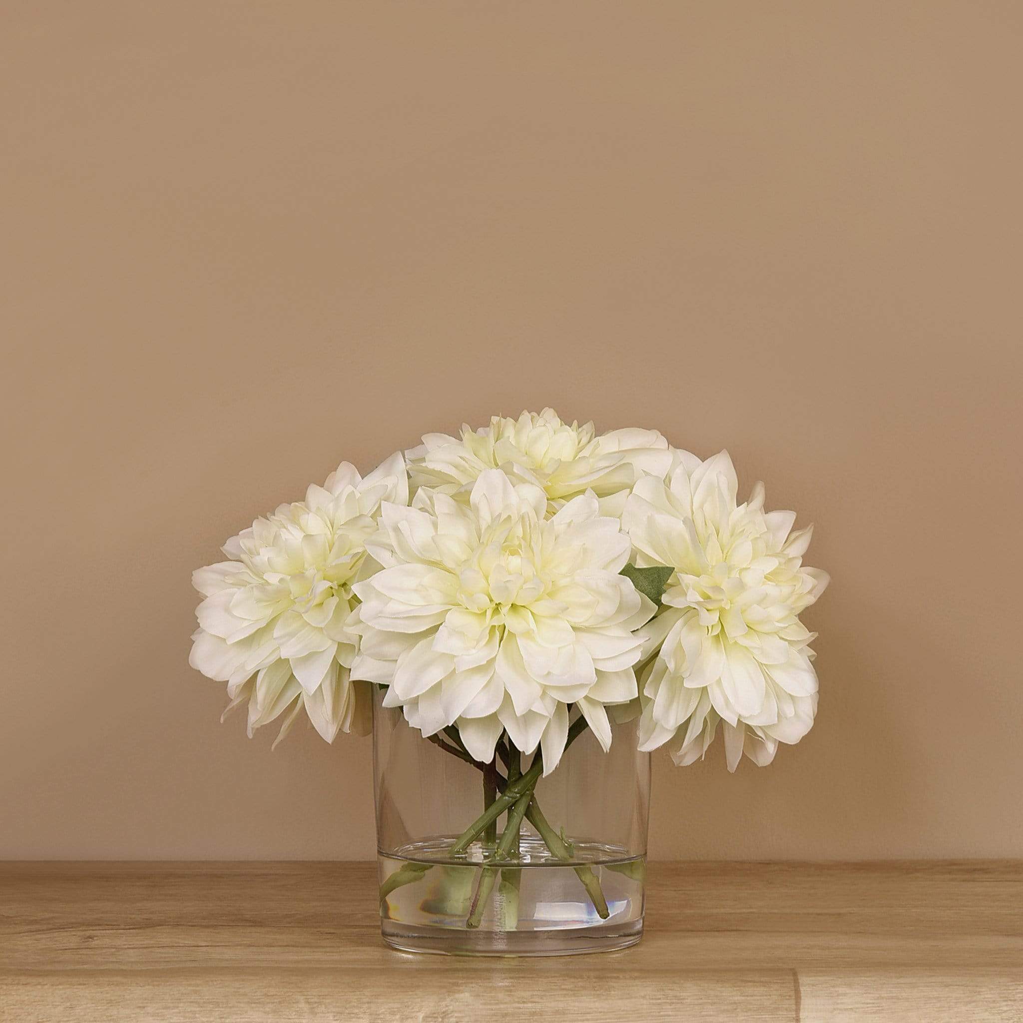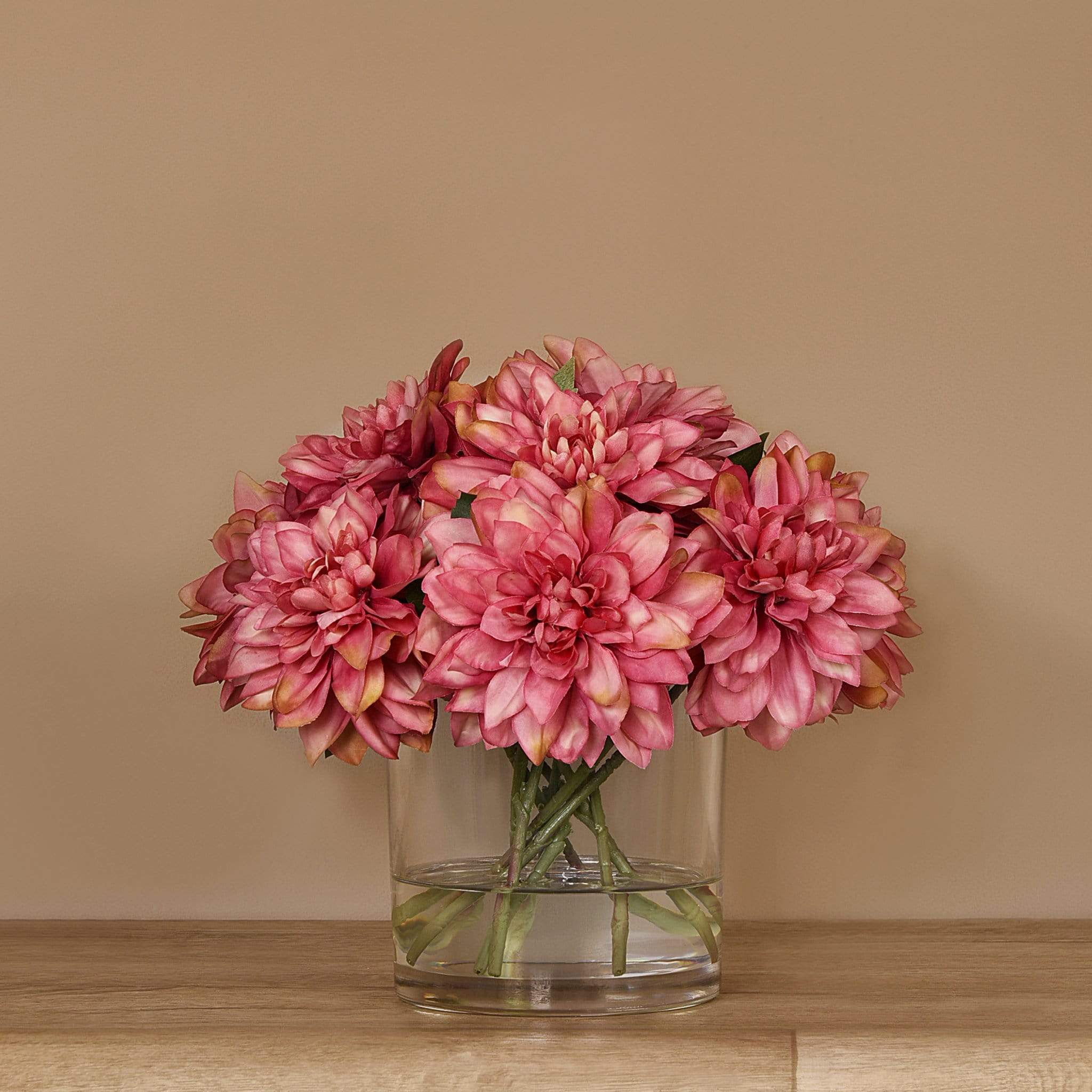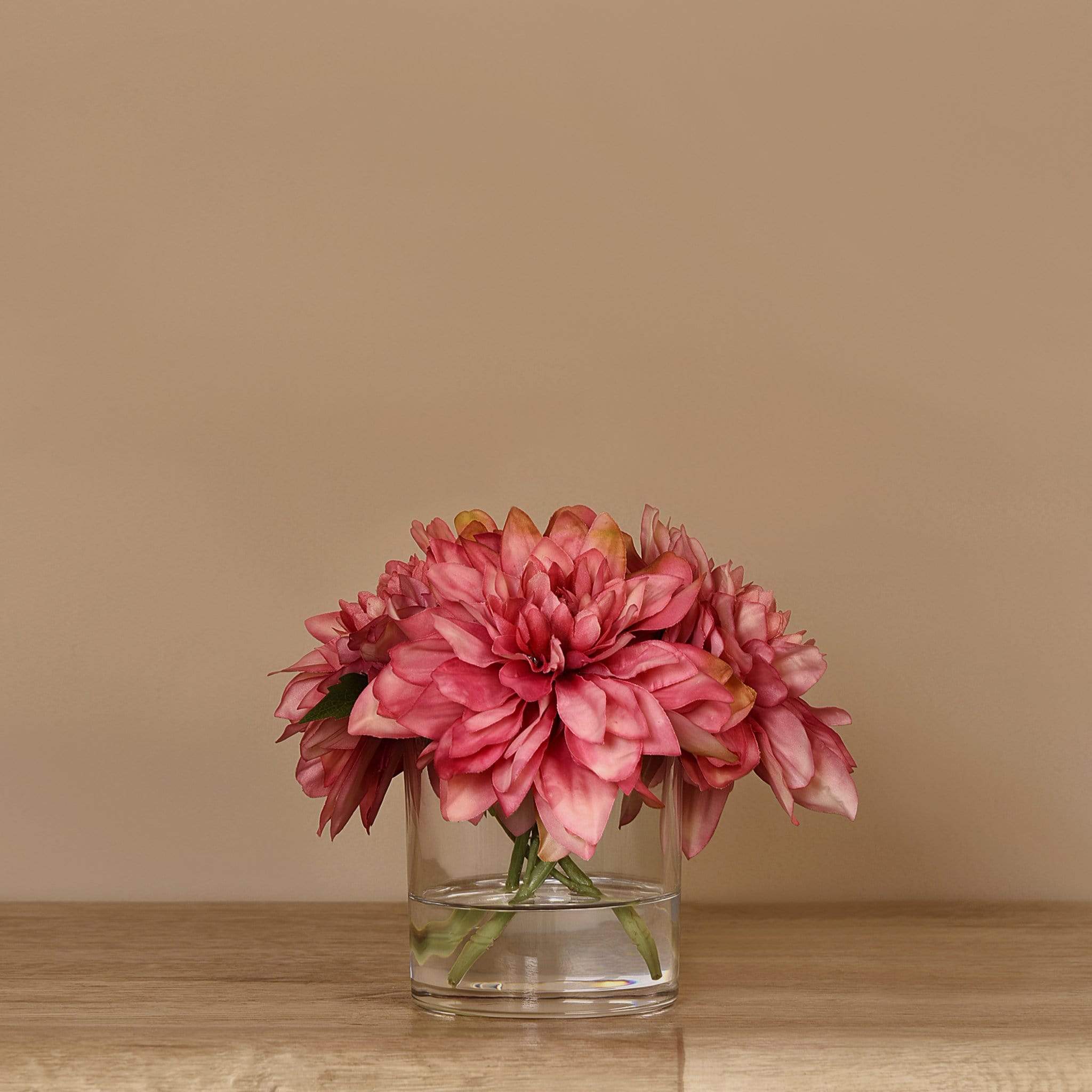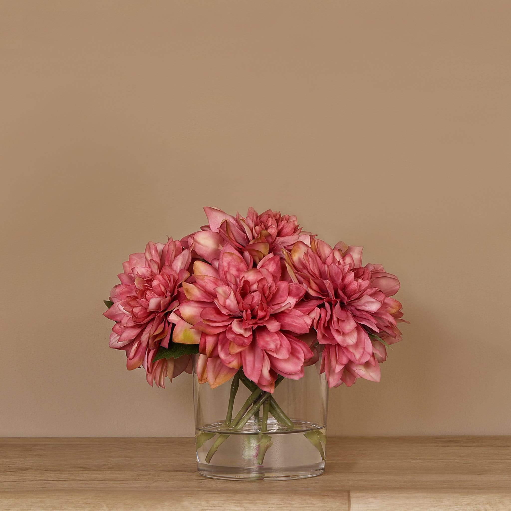 امنح منزلك أو مكتبك لمسة أنيقة تدوم مع تنسيقة داليا اصطناعية في مزهرية زجاجية — جزء من مجموعة بلومر الواسعة للديكور الداخلي الفاخر.