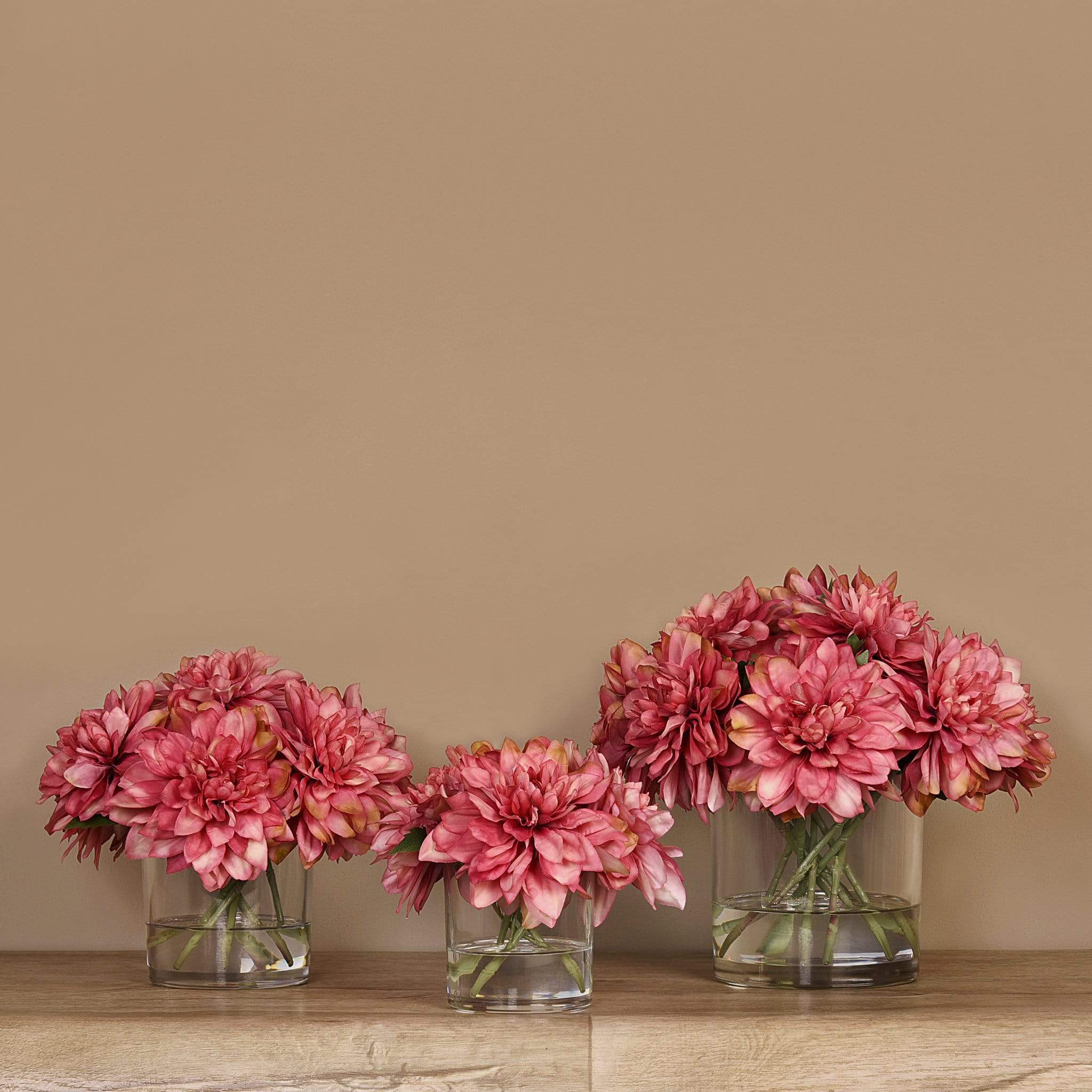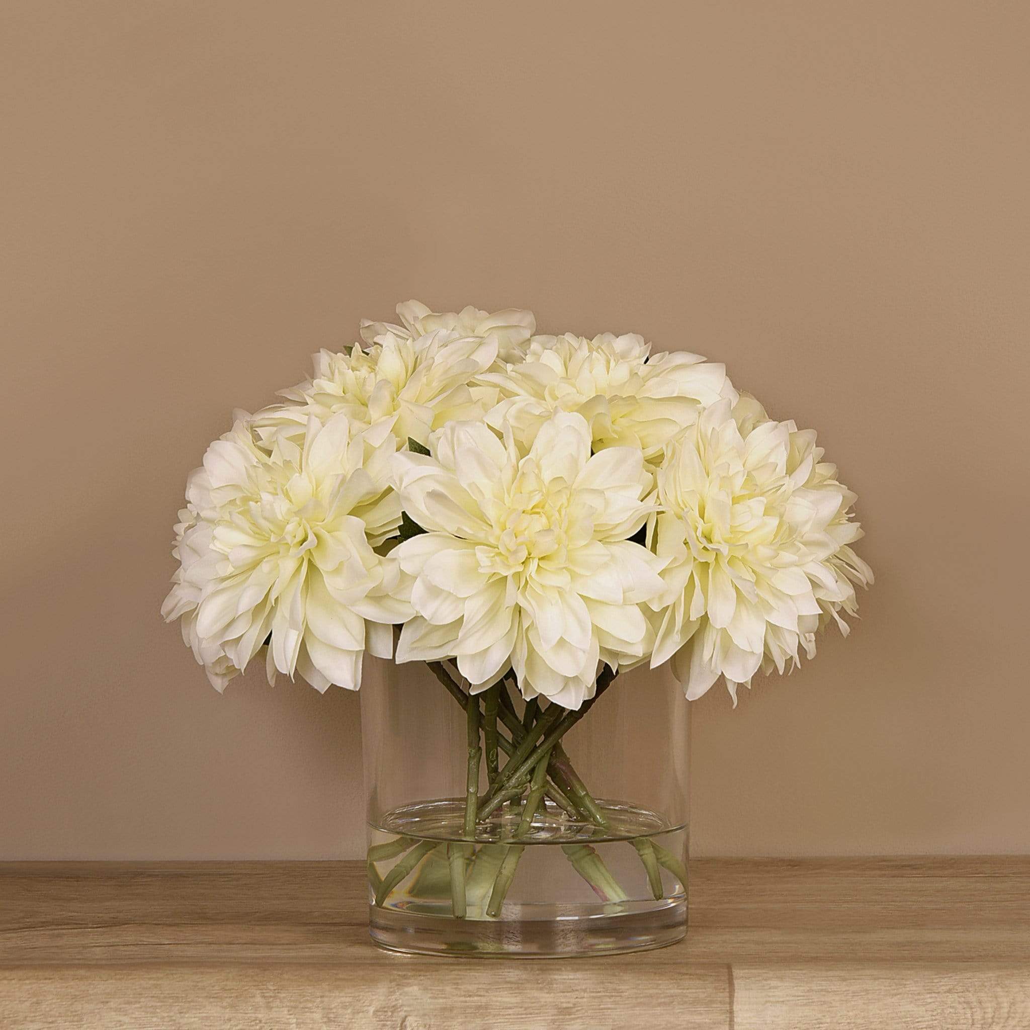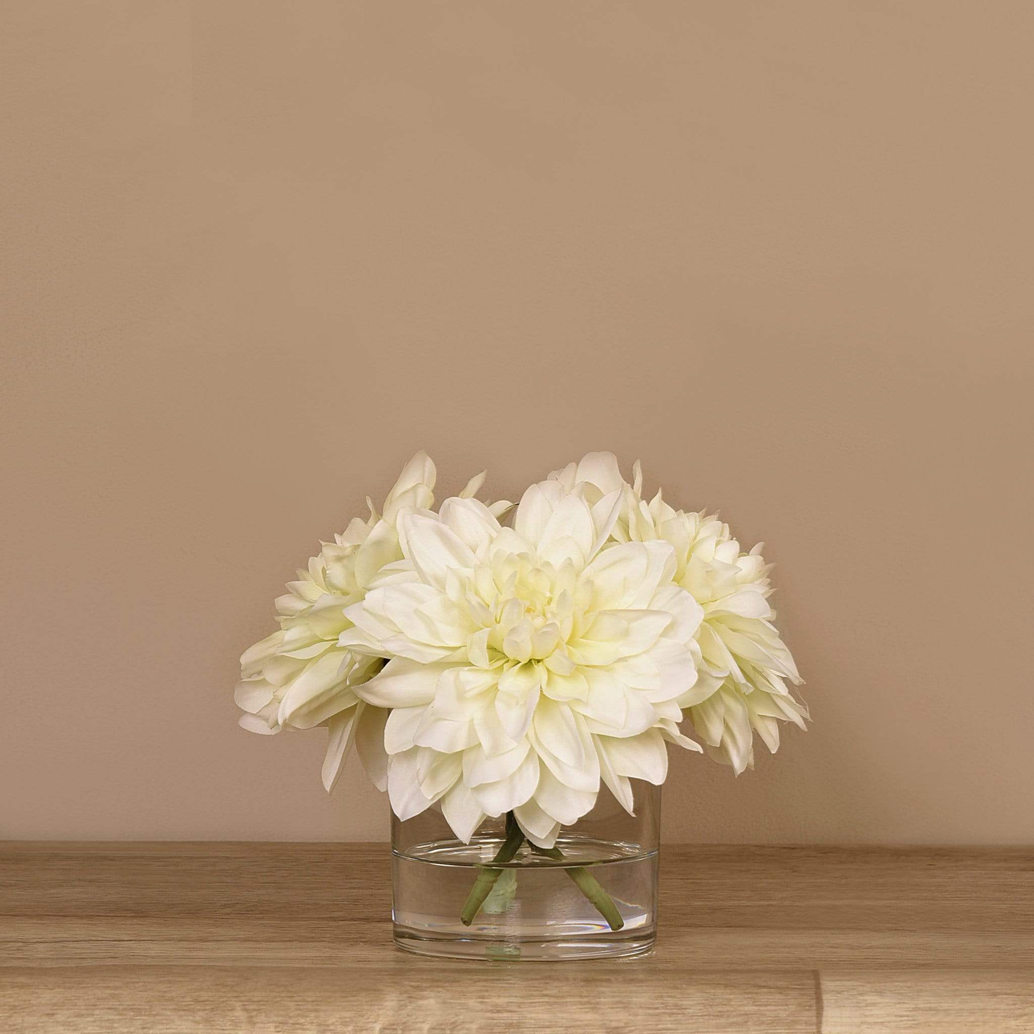 امنح منزلك أو مكتبك لمسة أنيقة تدوم مع تنسيقة داليا اصطناعية في مزهرية زجاجية — جزء من مجموعة بلومر الواسعة للديكور الداخلي الفاخر.