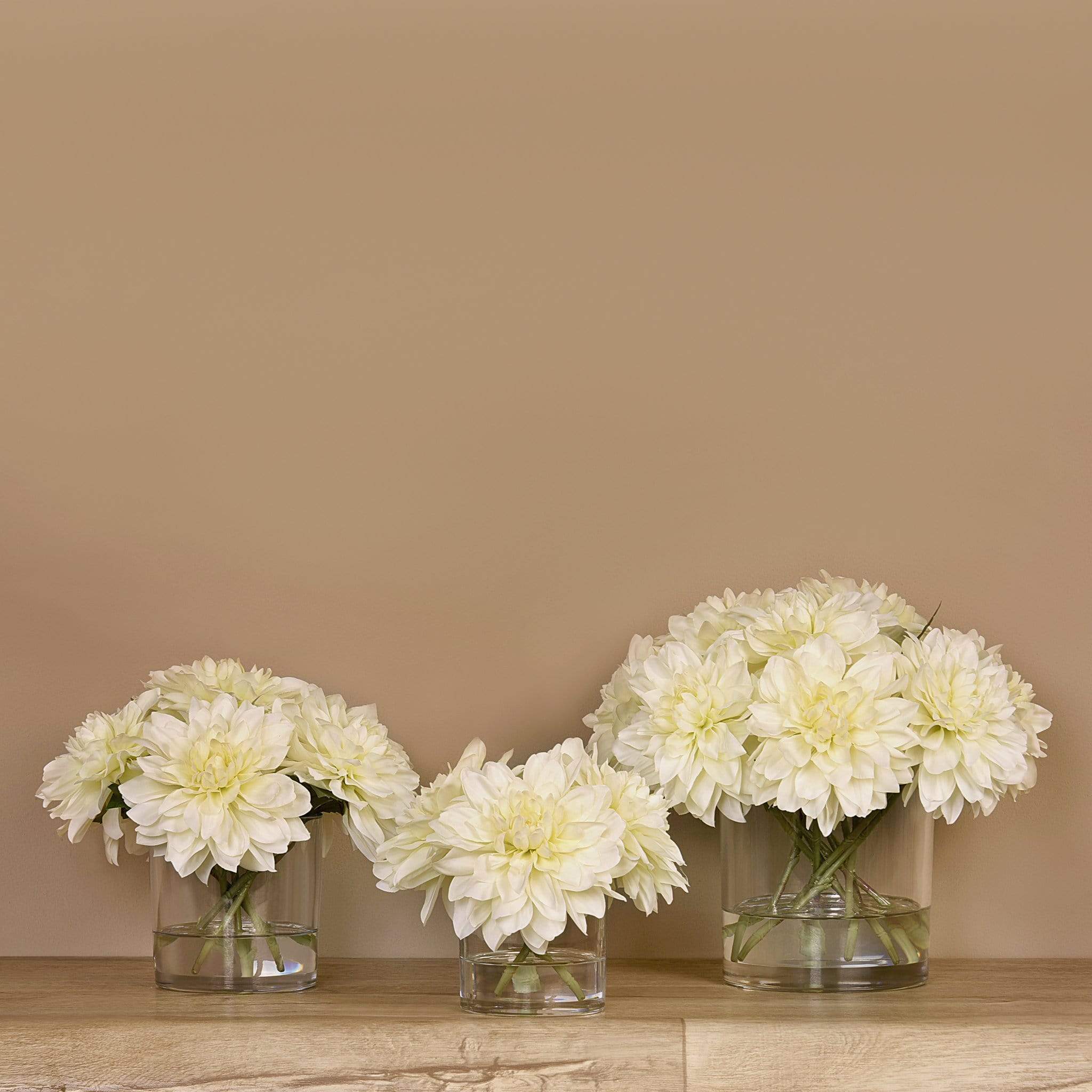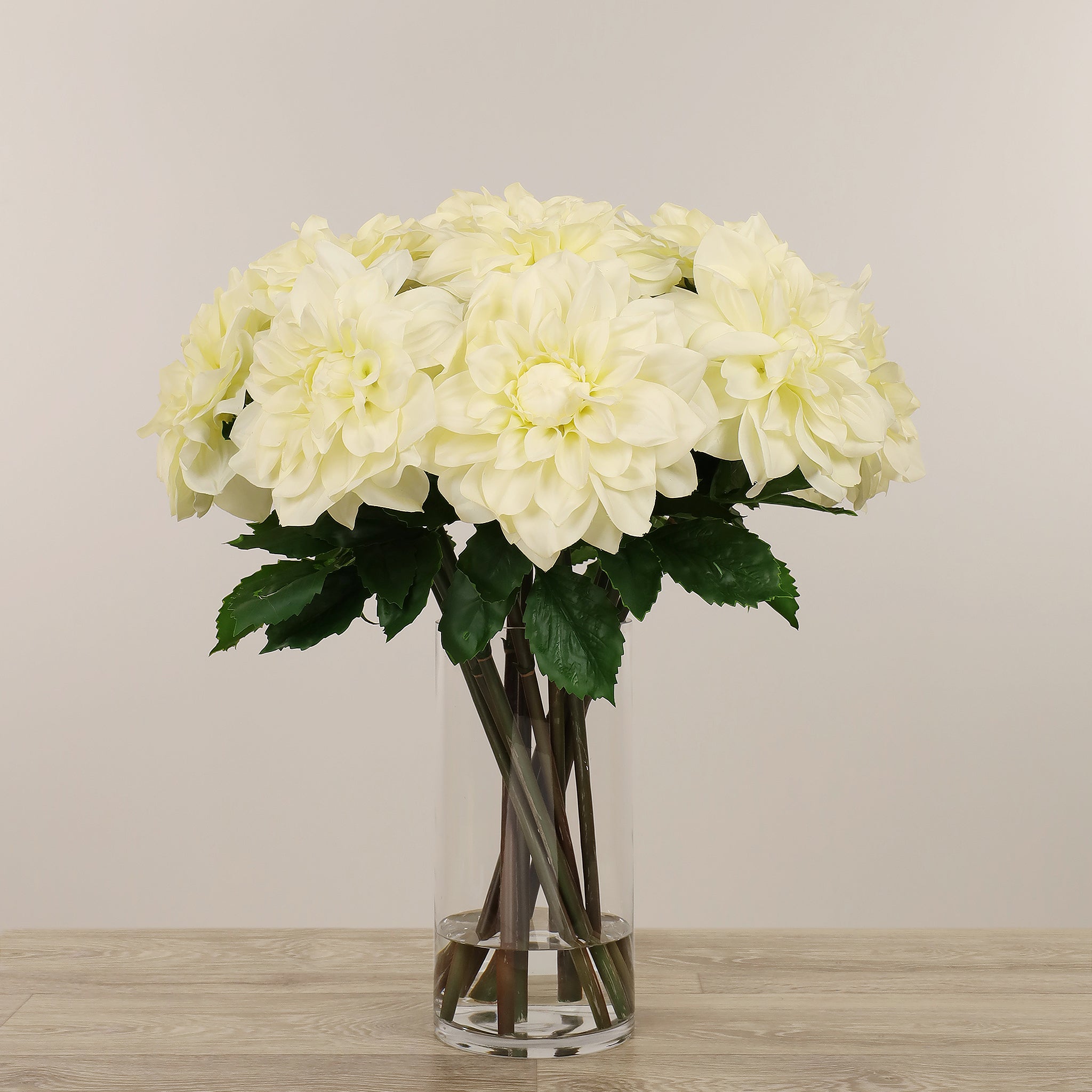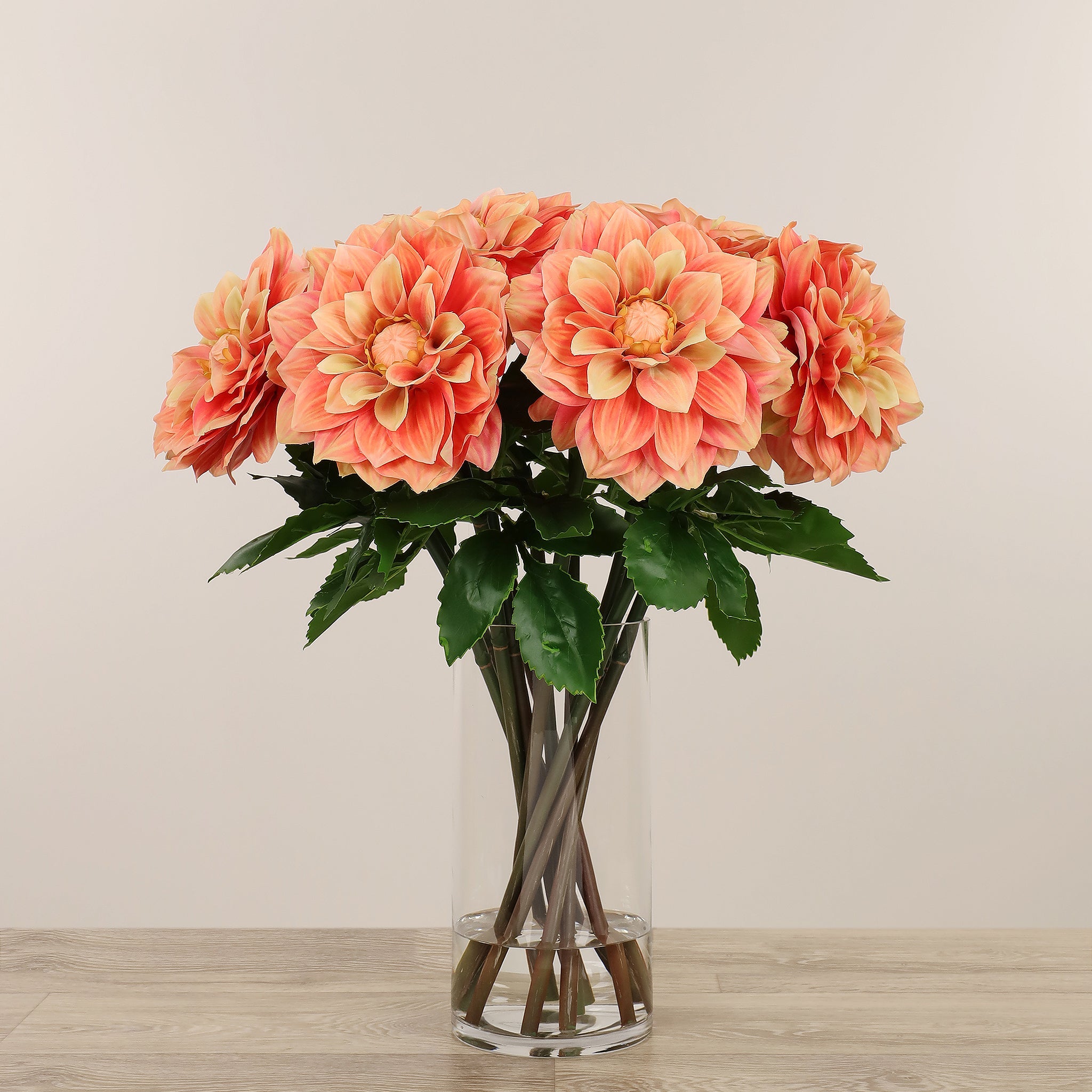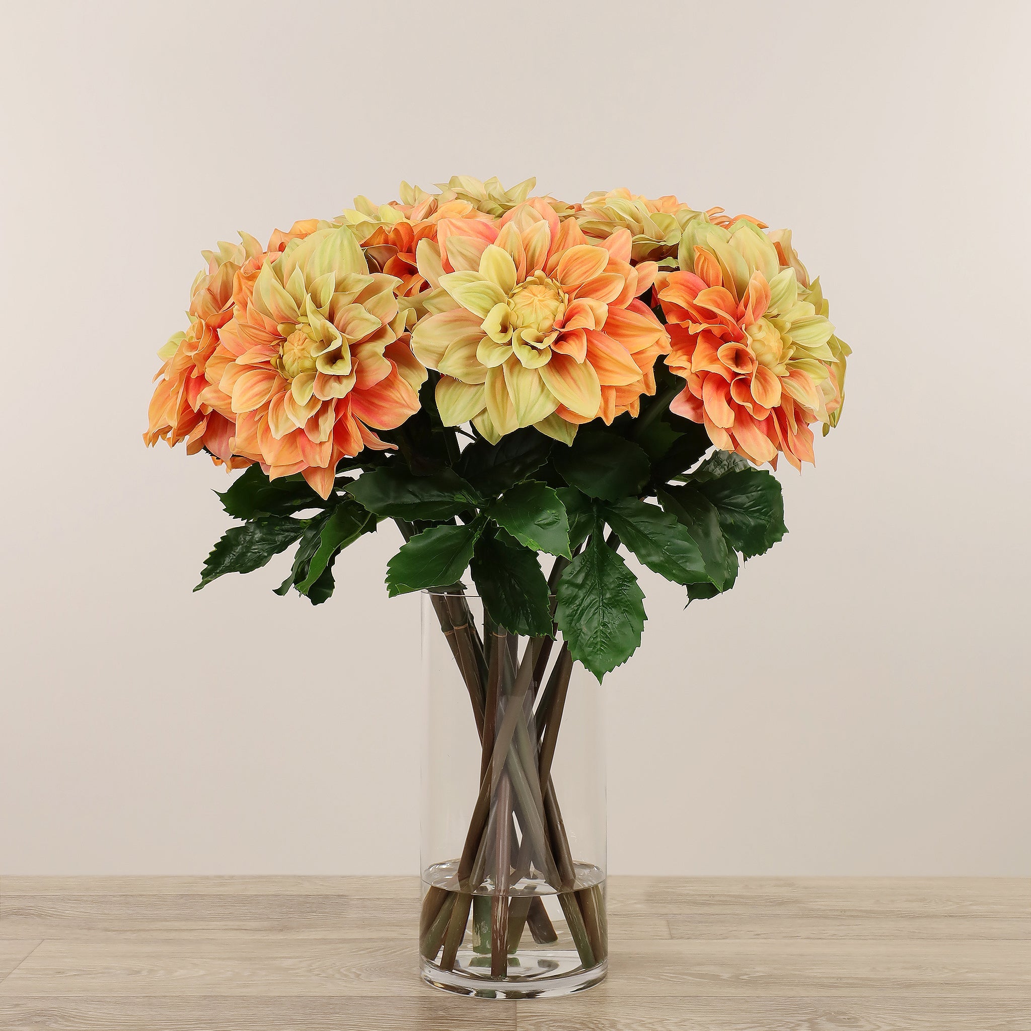 امنح منزلك أو مكتبك لمسة أنيقة تدوم مع تنسيقة داليا اصطناعية في مزهرية زجاجية — جزء من مجموعة بلومر الواسعة للديكور الداخلي الفاخر.