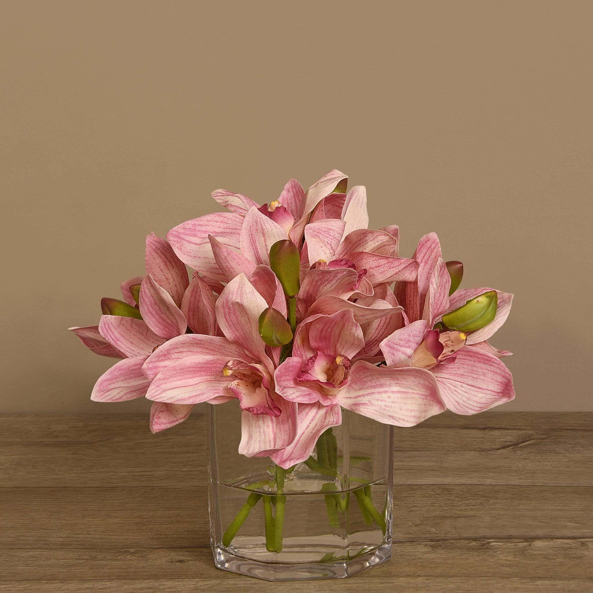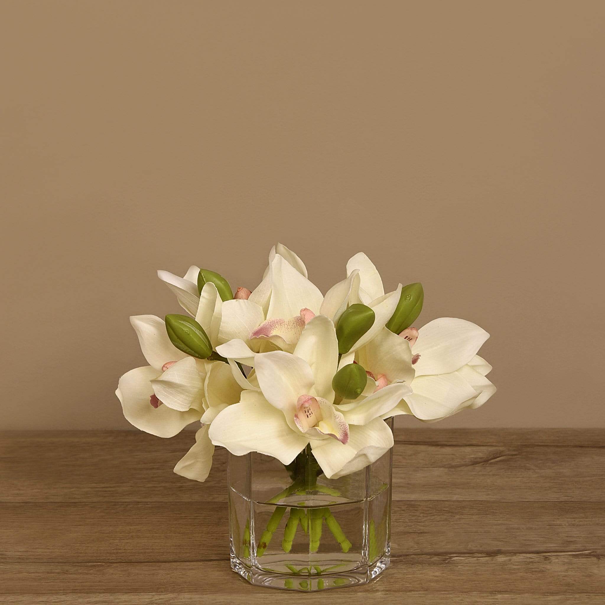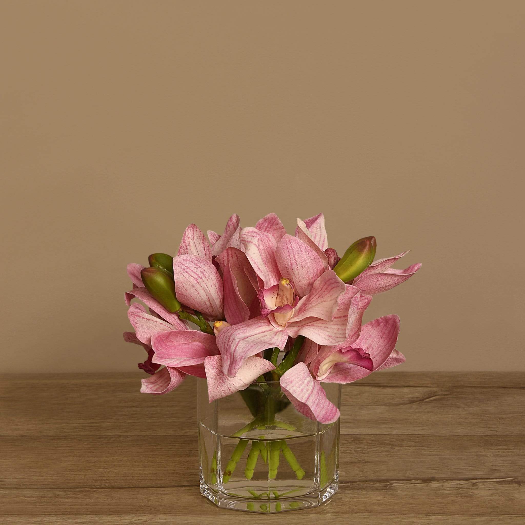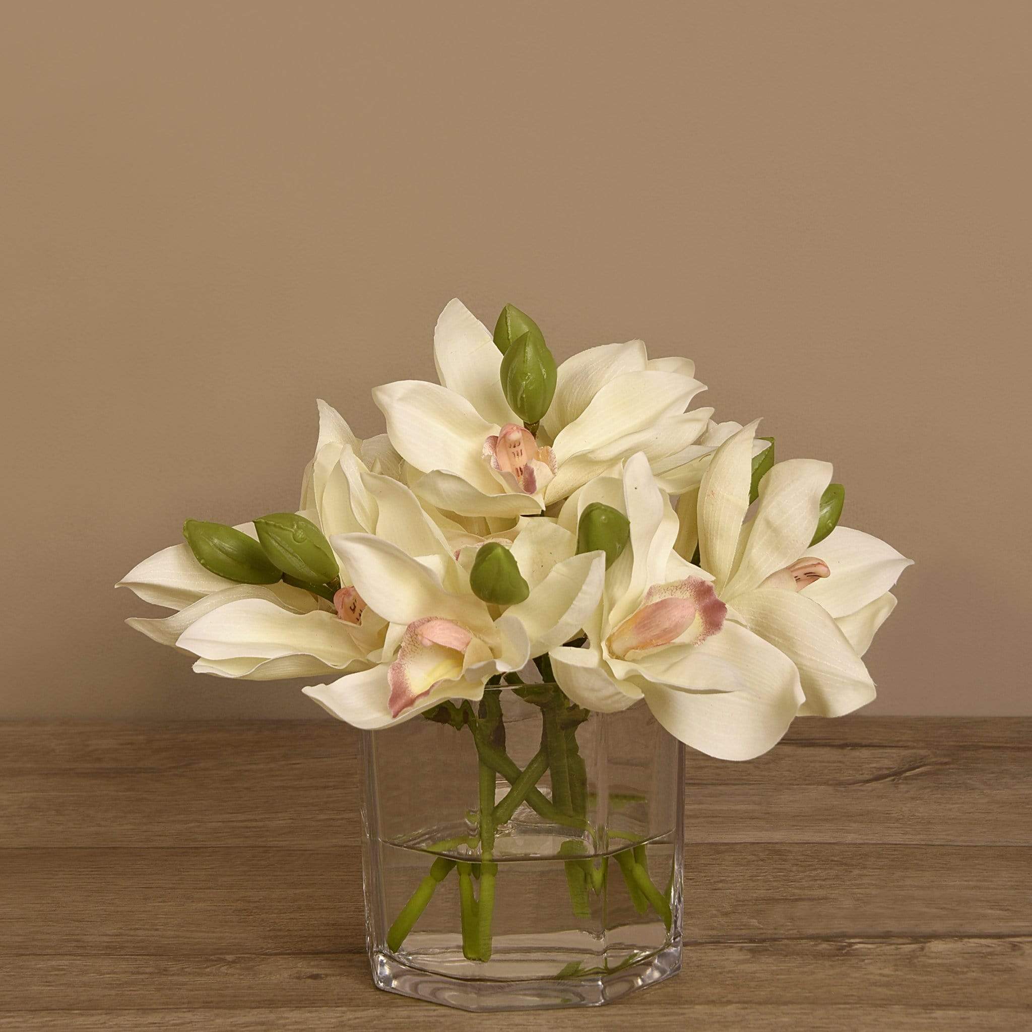 امنح مساحتك لمسة أنيقة وطبيعية مع باقة زهور سيمبيديوم الاصطناعية المعروضة في مزهرية زجاجية شفافة. تبدو هذه الزهور كما لو كانت حقيقية بفضل التفاصيل الدقيقة والألوان المتناسقة، لكنها تظل خالية من عناء العناية اليوميّة.