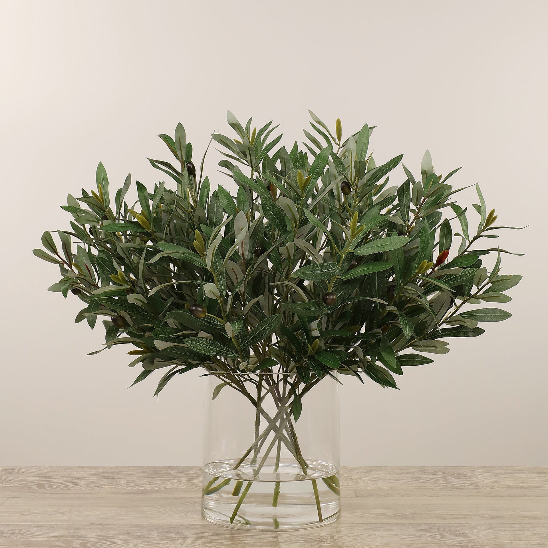 تنسيق زيتون اصطناعي مُرتّب بعناية داخل مزهرية زجاجية شفافة بتصميم أنيق. يجمع بين مظهر طبيعي واقعي وجودة خامات متينة ليبقى جميلاً طويلاً كعنصر زخرفي مستقل أو كجزء من تنسيق ديكور أكبر.