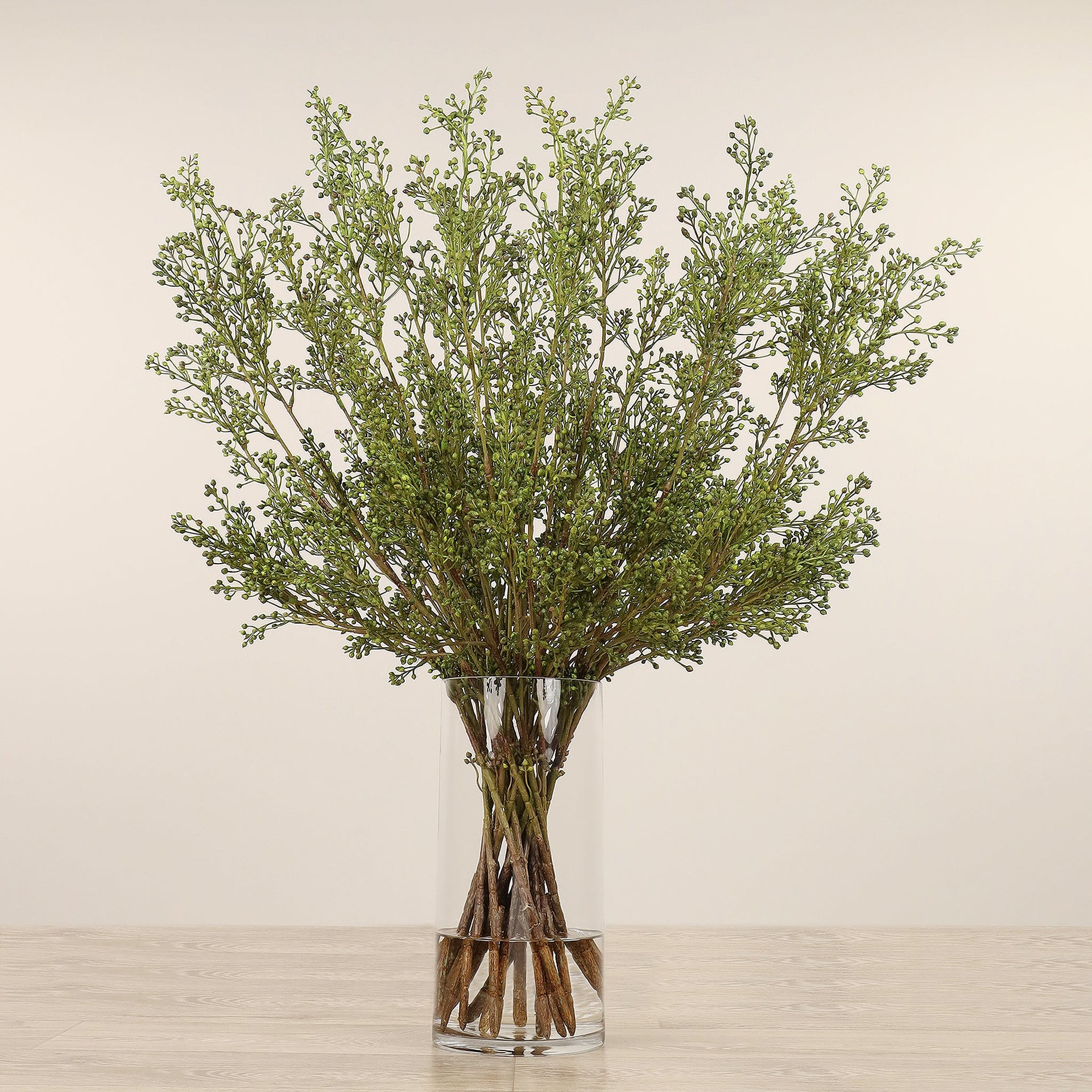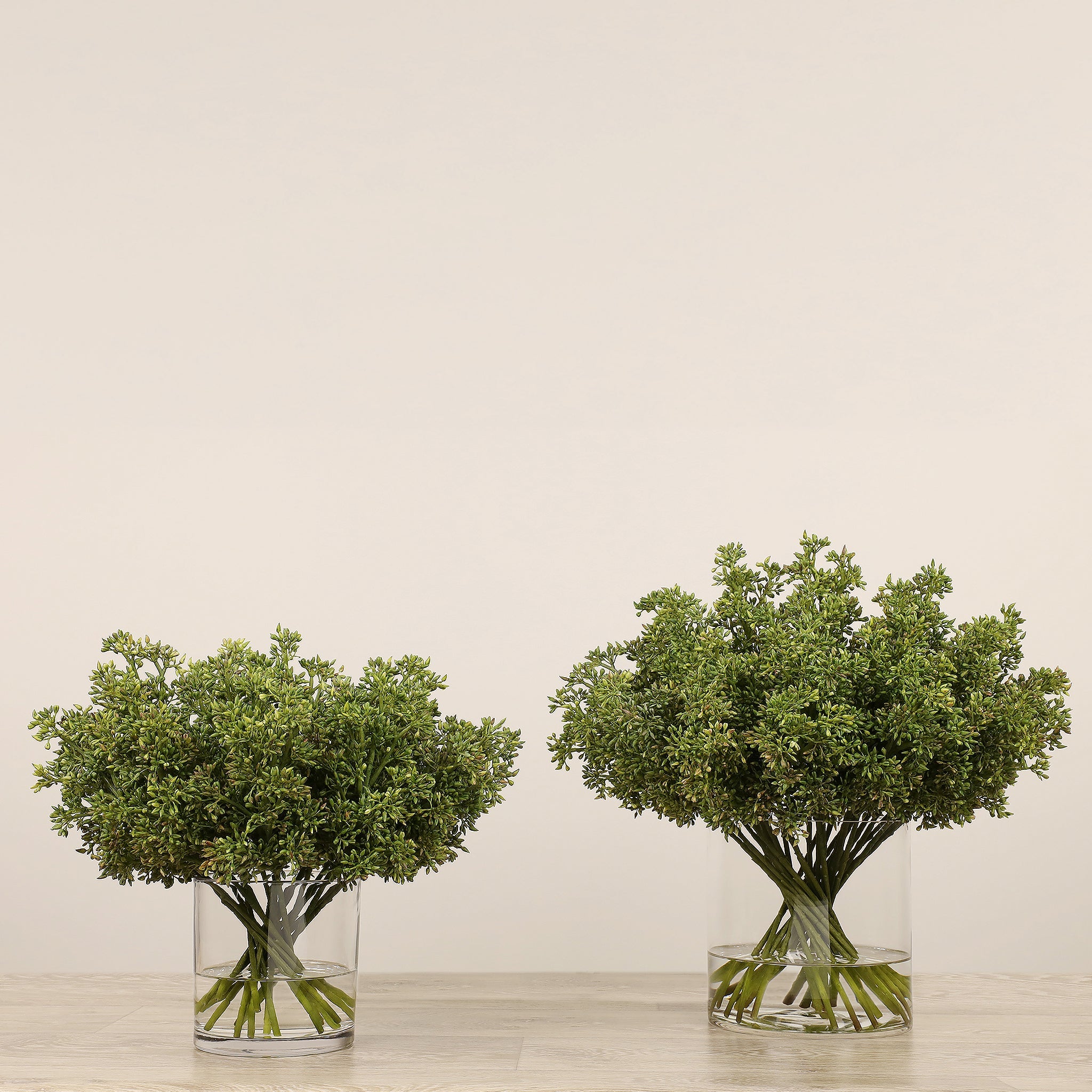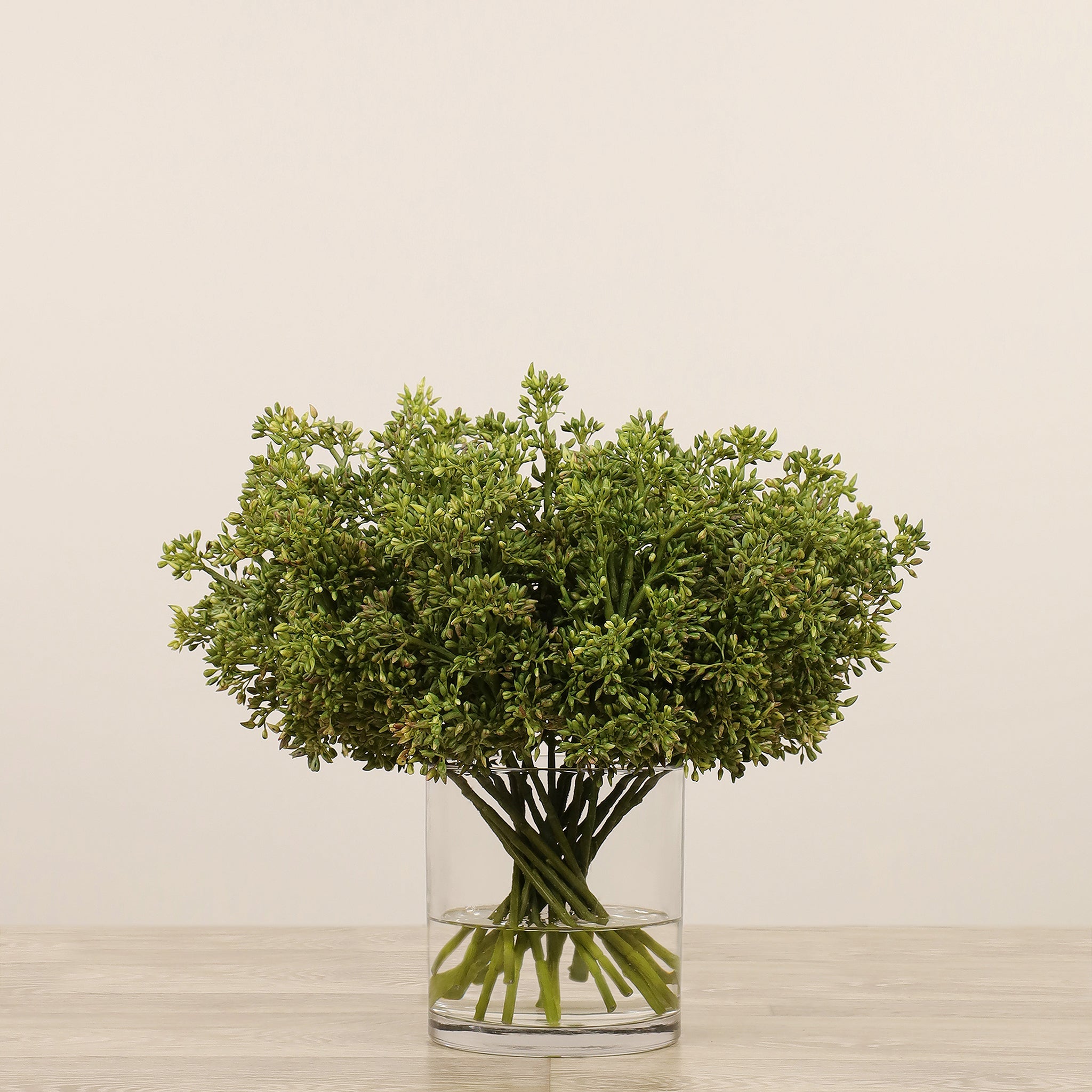 تشكيلة أنيقة من زهور السيدوم ذات المظهر الطبيعي موضوعة في مزهرية زجاجية شفافة — إضافة فورية من الأناقة والهدوء إلى أي ركن في المنزل أو المكتب من مجموعات بلومر المميزة.