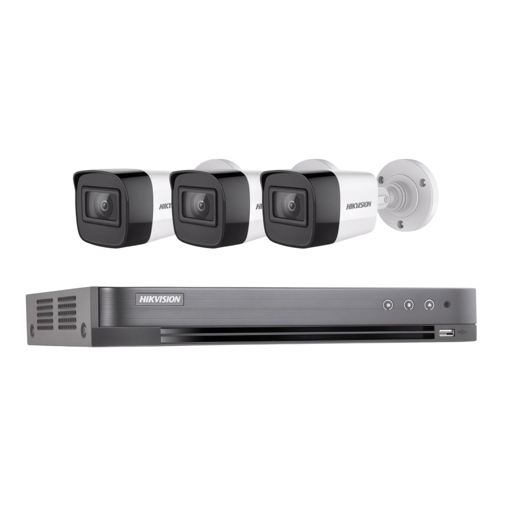 نظام مراقبة سلكي من Hikvision يتضمن ثلاث كاميرات خارجية بدقة 8 ميجابكسل (4K) مع جهاز تسجيل DVR رباعي القنوات وقرص تخزين داخلي بسعة 1 تيرابايت. كل كاميرا مزودة بعدسة ثابتة 3.6 مم بزاوية واسعة لتغطية أكبر مساحة مراقبة.