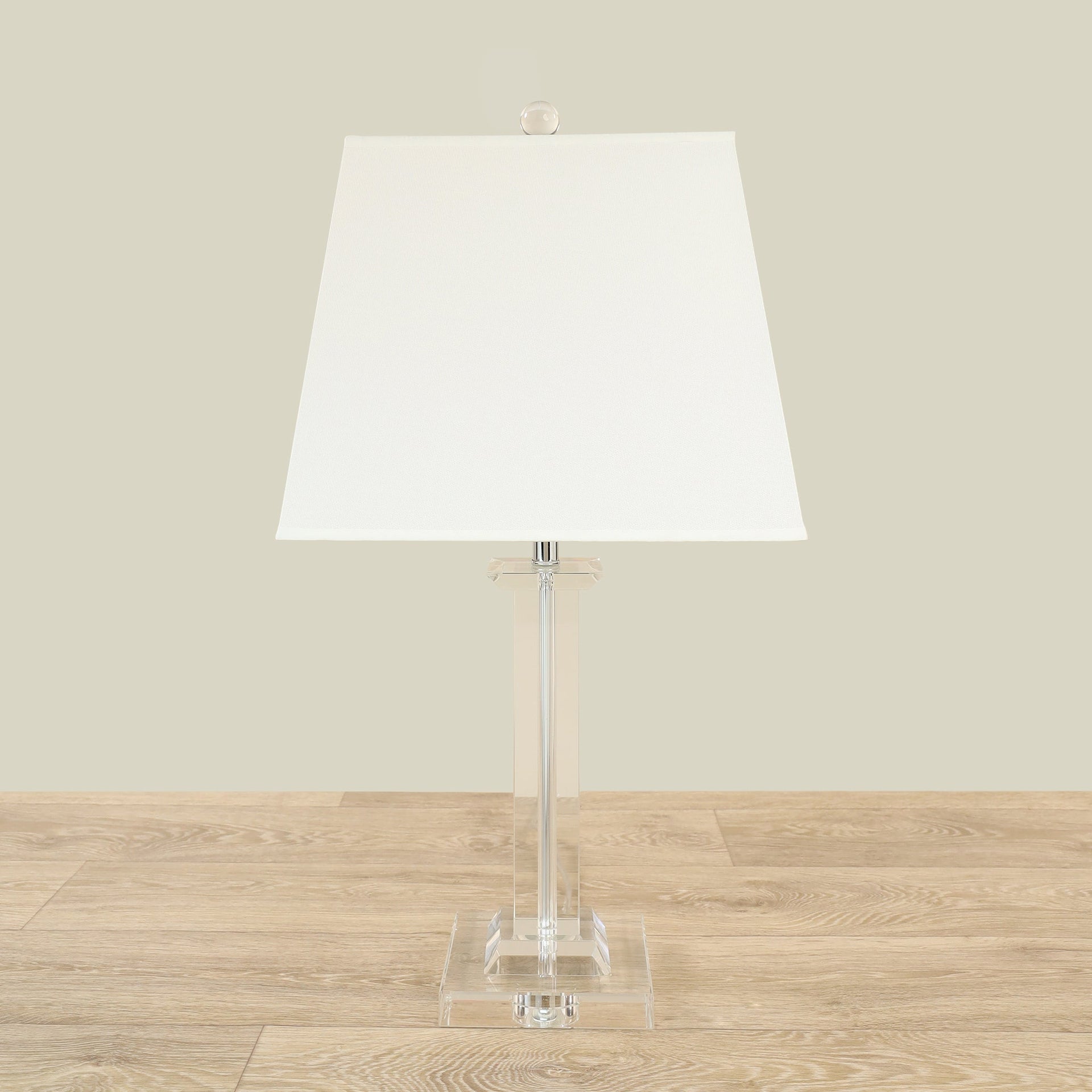 وصف موجز: مصباح طاولة بتصميم شفاف، مصنوع من الكريستال والقماش، مناسب للإضاءة الداخلية.