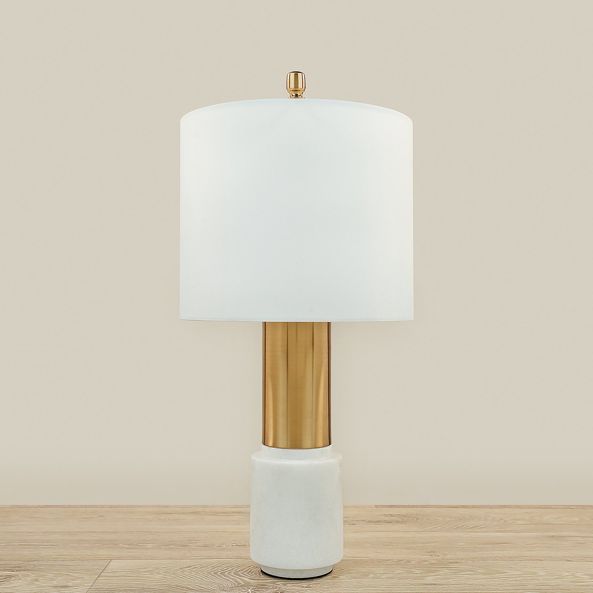 مصباح طاولة أنيق يجمع بين لمعان المعدن وفخامة الرخام الطبيعي ليمنح مساحتك لمسة راقية تناسب أنماط ديكور متعددة. قاعدة من الرخام المعروق مع لمسة معدنية براقة، وظل قماشي رقيق يسمح بإضاءة ناعمة ومتوزعة في أي مكان.