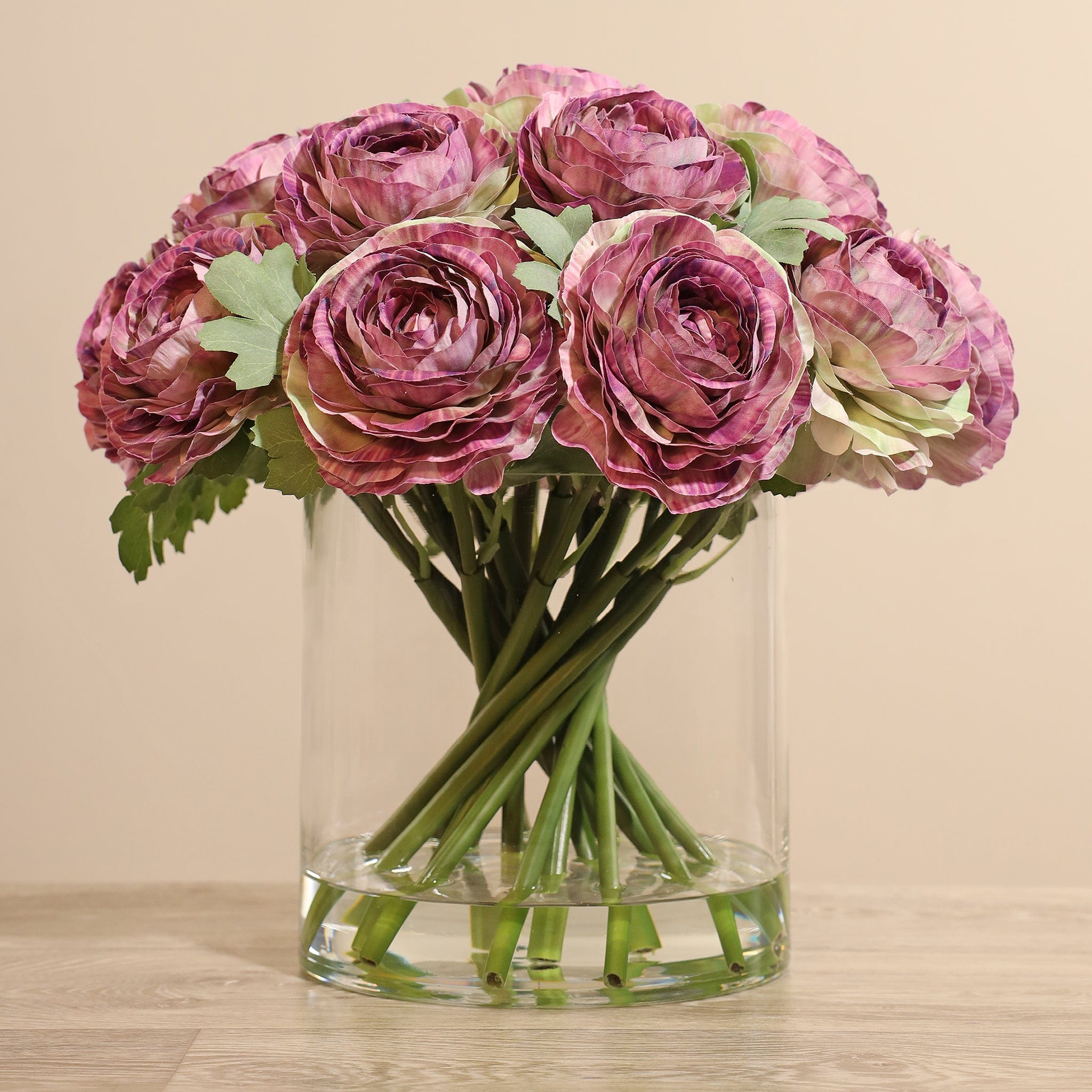 تشكيلة أنيقة من الحوذان الصناعية مرتّبة داخل مزهرية زجاجية شفافة — خيار عملي وجميل لتزيين المنزل أو المكتب دون الحاجة إلى عناية مستمرة.