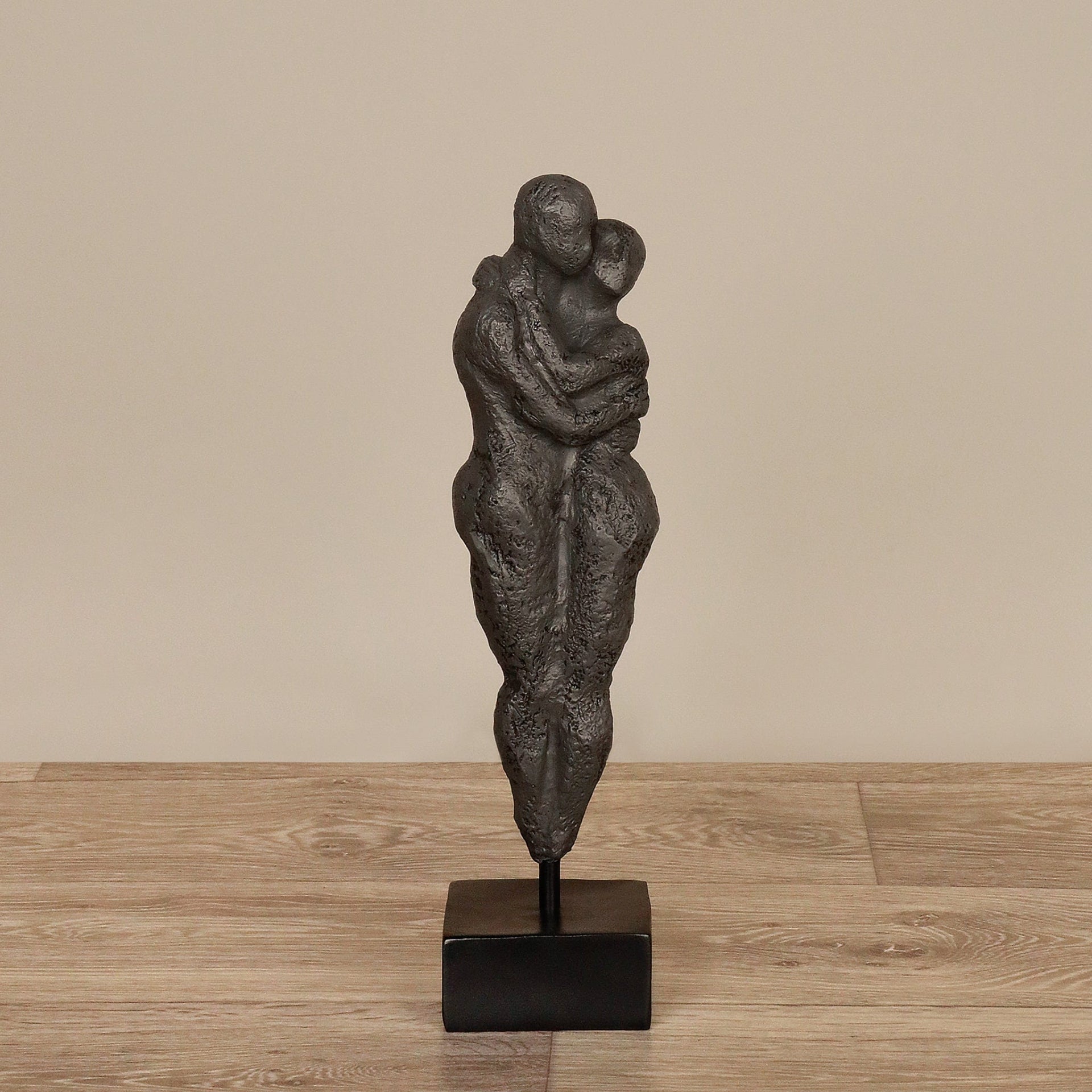 تمثال أنيق يجسد لحظة حميمية من العناق، مزوّد بقاعدة متينة تبرز الشكل الفني وتمنحه حضورًا مميزًا في أي مساحة. يتميز التصميم بتدرجات لونيّة هادئة بالأسود والبني تضيف دفءً وأناقة لتنسيق الديكور الداخلي.