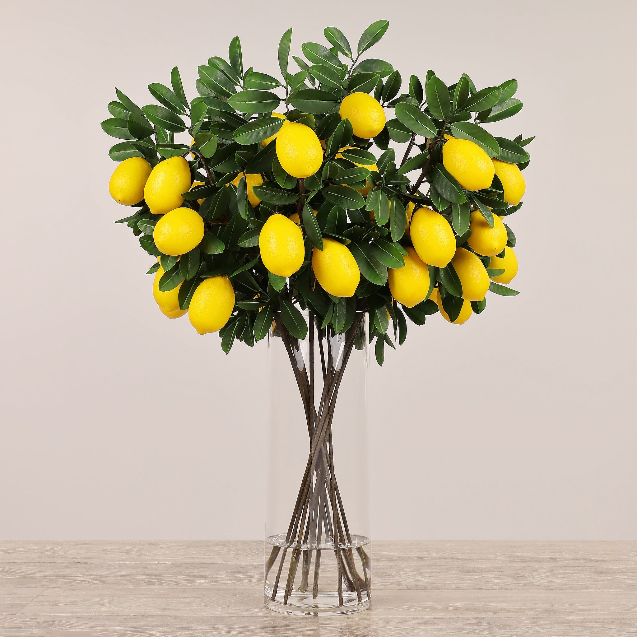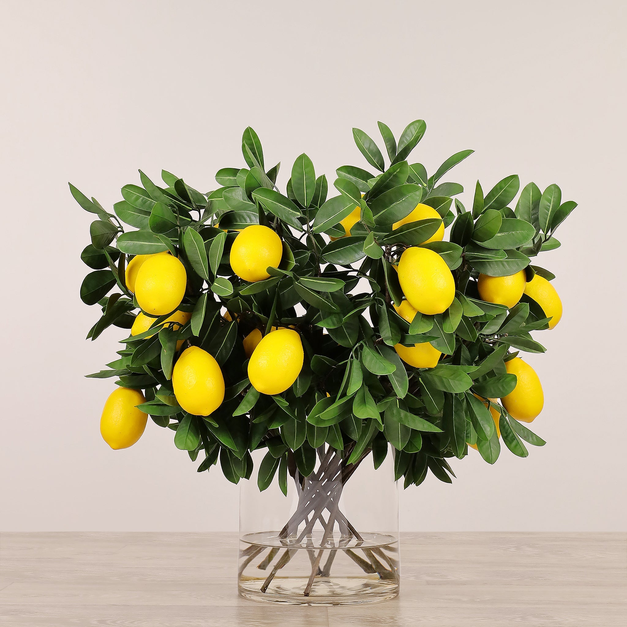 قطعة ديكور أنيقة من مجموعة بلومر للديكور الداخلي الفاخر: ترتيب دمعة الليمون الاصطناعي يوضع داخل مزهرية زجاجية شفافة ليمنح مساحتك لمسة منعشة وطبيعية دون عناء العناية بالنباتات الحية.